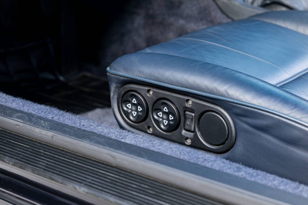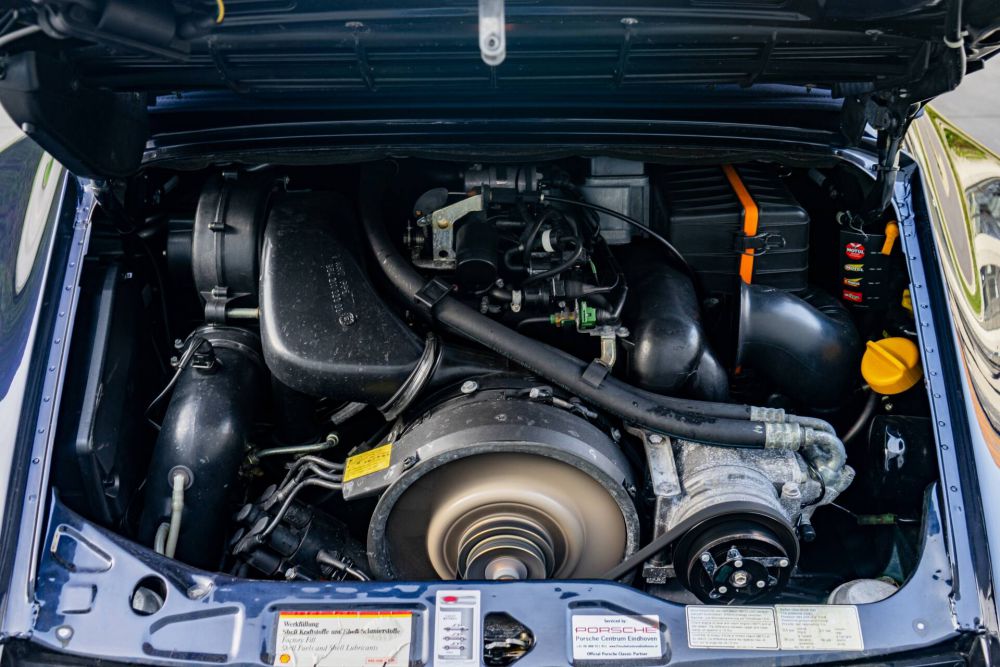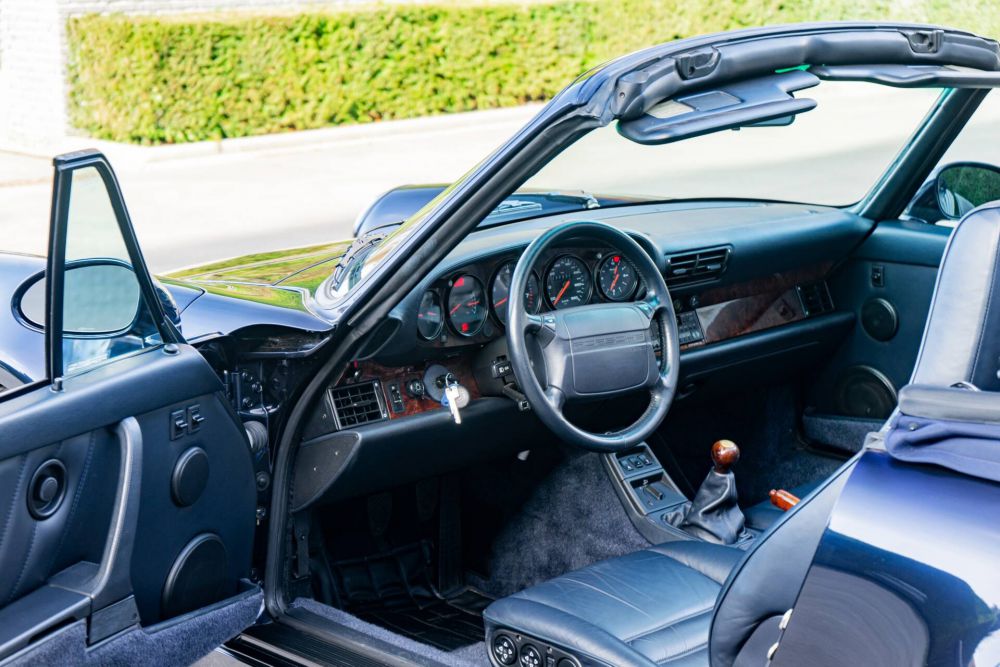 Our example is also fitted with standard options including draped front and rear seats, a Blaupunkt cassette car radio, tinted windscreen and with wheels with colored Porsche logo. It went to Werks1 or Porsche Exclusive as we know it today for some custom options including a full Rootwood interior and a leather convertible top cover.