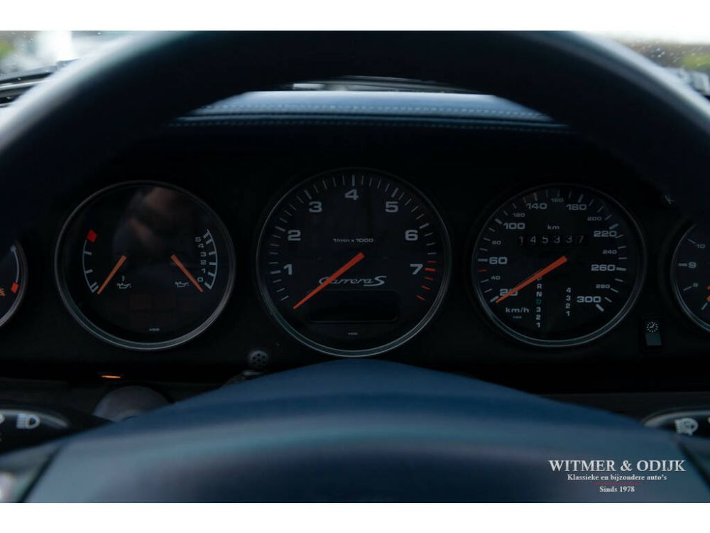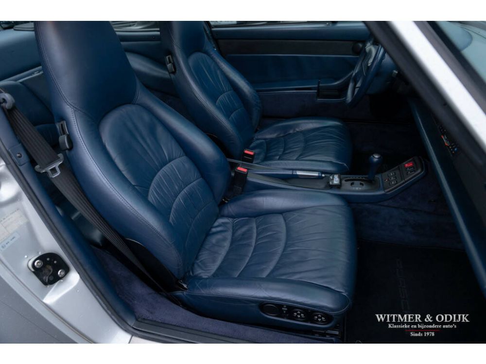 Een van de zeldzaamste Porsche's uit het laat-luchtgekoelde tijdperk is de Carrera S. In de ruim bemeten jas van de 993 Turbo is de Carrera S een lust voor het oog. Vooral de sexy achterzijde van dit fraaie model doet de liefhebber watertanden. Optisch onderscheidt de Carrera S zich het duidelijkst van de 'normale' 993 en ook de 4S door het in twee delen gesplitste rooster in de elektrisch uitklappende achterspoiler. De carrosserie en voor- en achterbumper zijn gelijk aan die van de Turbo. De Carrera S werd slechts 3500 keer gebouwd waarvan ongeveer 2000 exemplaren de comfortabel te rijden automatische Tiptronic S versnellingsbak meekreeg, op een sportief moment desgewenst handmatig op het stuur te schakelen. Zeldzaamheid is dé voorwaarde om het kopen van een Porsche ook een verantwoorde investering te laten zijn. De Porsche in kwestie moet dan ook wel een hele échte zijn, waarvan hier akte. Deze 993 Carrera S werd in 2001 al vanuit Duitsland naar Nederland gebracht. Ze is volledig origineel en schadevrij. Altijd in handen geweest van liefhebbers die louter officiele dealers of bekende specialisten aan de auto lieten werken. Er is een lijvig en compleet dossier bij de auto aanwezig. Boekjes, rekeningen, sleutels, etc. alles compleet en origineel voorhanden. Zeer compleet uitgevoerd met o.a. elektrisch schuifdak, automatische climat control, volledig elektrisch verstelbare stoelen, raf-leer, derde ruitenwisser, automatische Tiptronic-S versnelling met stuurbediening, centrale deurvergrendeling met afstandbediening, boordcomputer, stoelverwarming, originele Blaupunkt radio/cd speler, etc. Op de Carrera S was alleen Arctic zilver metallic de verkrijgbare zilver-variant. Deze kleur was de laatste variant zilver in de 993 serie. Gebruikt in '97 en '98. De carrosserie van deze Carrera S is nog origineel en in de eerste lak. Tegelijkertijd zijn er nauwelijks gebruikssporen. Zelfs de lage neus heeft geen zichtbare steenslag. Ook de in de wagenkleur gespoten bumpers zijn vrij van parkeervegen of deukjes. Perfecte passingen van deuren en motorkap en kofferklep. Een prachtig origineel geheel. Het diep donkerblauwe interieur (de foto's geven het te hard blauw weer) is in nieuwstaat. Het is volledig in leer uitgevoerd, dus ook op het dashboard en deurpanelen treft u mooi dubbel doorgestikt leer. Op de stoelen zgn. raf-leer wat een comfortabelere zit biedt. De stoelen en vloerbekleding hebben geen beschadigingen of instapsporen. Het donkerblauwe in leer uitgevoerd stuur is mooi glad en onbeschadigd. Alle schakelaars, hendels en klokken zijn mooi schoon en functioneren naar behoren. Originele Porsche matten voor de stoelen. De originele 285pk sterke VarioRam motor treft u in de schone en verzorgde motorruimte. Alle fabrieksplaatjes en stickers keurig aanwezig. De motor is mooi droog, draait perfect rond en rookt uiteraard niet. In de kofferruimte voor zijn thuiskomer, gereedschap en krik allen aanwezig. De 18 inch Turbolook velgen hebben geen parkeerbeschadigingen en zijn vrij van ingevreten remstof. Voorzien van uitstekende Continental Sport Contact banden met Porsche N-codering. Nieuw verkocht in 1997 door een Duitse Porsche dealer. Een bekende Porsche specialist haalde de auto in 2001 met een zeer lage kilometerstand naar Nederland. Keurig voorzien van alle originele bescheiden zoals boordmap met boekjes en reservesleutel. Compleet en duidelijk navolgbaar serviceverleden. In 2017 hadden wij deze 993 al eens in de collectie. Onze klant reed slechts 5.000km met de auto, we zijn verheugd dat we de auto weer terug mogen hebben in de showroom! Echt een compromisloze 993 Carrera S. Zie onze website voor meer dan 100 foto's www.witmerodijk.nl of gebruik de volgende link, https://witmerodijk.nl/te-koop/porsche-993-carrera-s-tiptronic-145.000km/2420