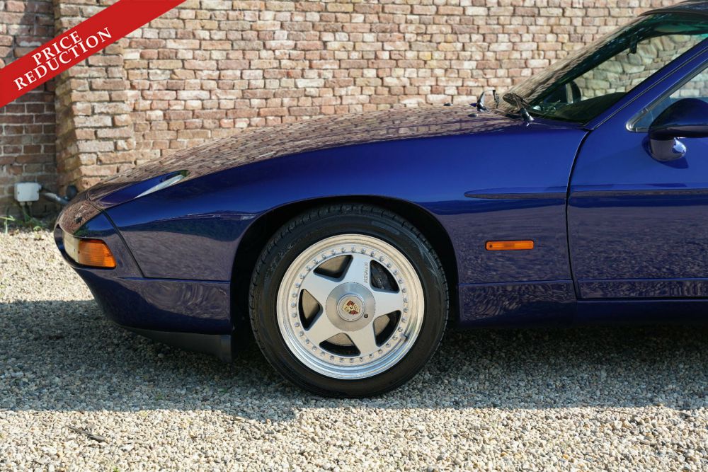 The first thing you spot on this 928 S4 are the S4 modifications. The Porsche 928 S4 has improved front brakes, front and rear spoilers, a digital trip computer. The Cobalt blue paintwork is showing some signs of normal use, but overall is in very good condition. The very special OZ Futura rims are another remarkable feature. The bodywork is in good shape with nice, original and correctly aligned panelwork.