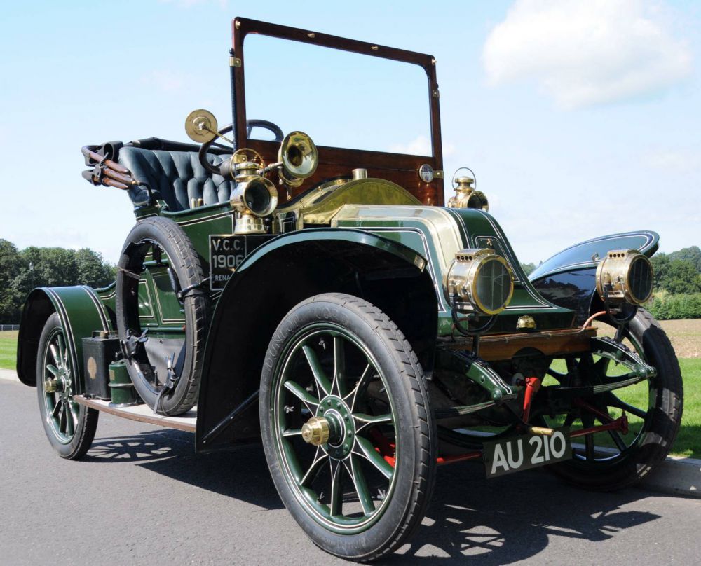 1906 Renault AH 4 cylinder Chassis Number: 6061 Registraton Number: AU210 A very rare survivor of the type with just a few known world wide. This renault was supplied new to the UK & carries original coachwork by Starey's & Wolleys of Nottingham. The car is in beautifully preserved condition having been owned by the current owner for some 15 or so years. Immediatly after purchase he had the engine rebuilt with new pistons etc & also changed the problematic Claudel Hobson Carburettor to a Zenith unit which imporved the perfomance, running & ease of starting no end. The car is currently located in South West Wales where it is used only sparkingly for short jaunts round the local countryside. The car has a full hood & side screens should they ever be required. We can attest that the roof makes a great sunshade on 32 degree days. Starting the car is simple: Turn on the fuel tap, flood the carb', Put the magneto to Marche as opposed to arrette & give the starting handle a lusty swing. It then settles down to an even steady idle. The car has a tumbler type sequential gear box allowing forward progress in one of three ratios. Reverse is selectd by pulling the lver rearwards. For the uninitiated it is easiest to push the gear past the ratio you want & then to come bak into it by moving the gear lever rearwards. Once understood & mastered it makes for easy changes. Some large bills are on file from Noted veteran specialist Niger Parrot for works to both gear box & engine. The car is finished in patinated coach painted green along with white fine lines. Wheels are spoke wodden items shod with beaded edge tyres. The car is festooned with all kinds of brassware including assorted lamps & a coil type horn. We would not reccomend motorway driving in it but it is very comfortable chuffling along B roads & by ways. The interior is green buttoned lether which replaced the original lether that looked quite worn out in a photograph dating from the early 1960's. The car as a whole has a nicely untouched feel to it save for the new seat upholstery & is mechanically strong as the required money has been spent on it. Braking is effected by both a pedal for the rear wheels & the handbrake on the transmission. A good assortment of paperwork comes with the car including an early VCC dating plaque & certificate issued in 1955.