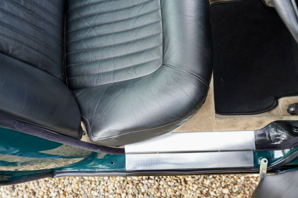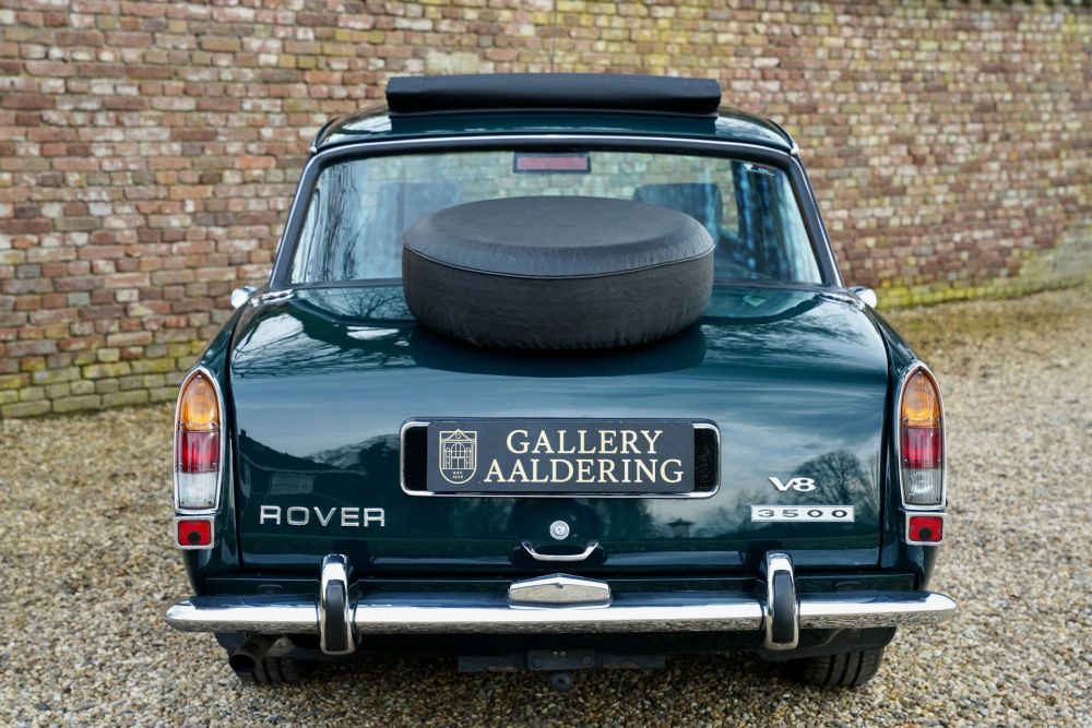 This Rover P6 3500 has undergone comprehensive restoration and mechanical refurbishment. The British Racing Green paintwork looks stunning, has been expertly resprayed, and the bodywork is in great shape. A few charming details: the spare wheel mounted on the trunk lid (doesn’t that add to the charm?) and the Rover-branded mud flaps, which complete the 1970s aesthetic. The chrome bumpers and windows are in good condition, and the Webasto sunroof is a fantastic addition, perfect for summer drives.