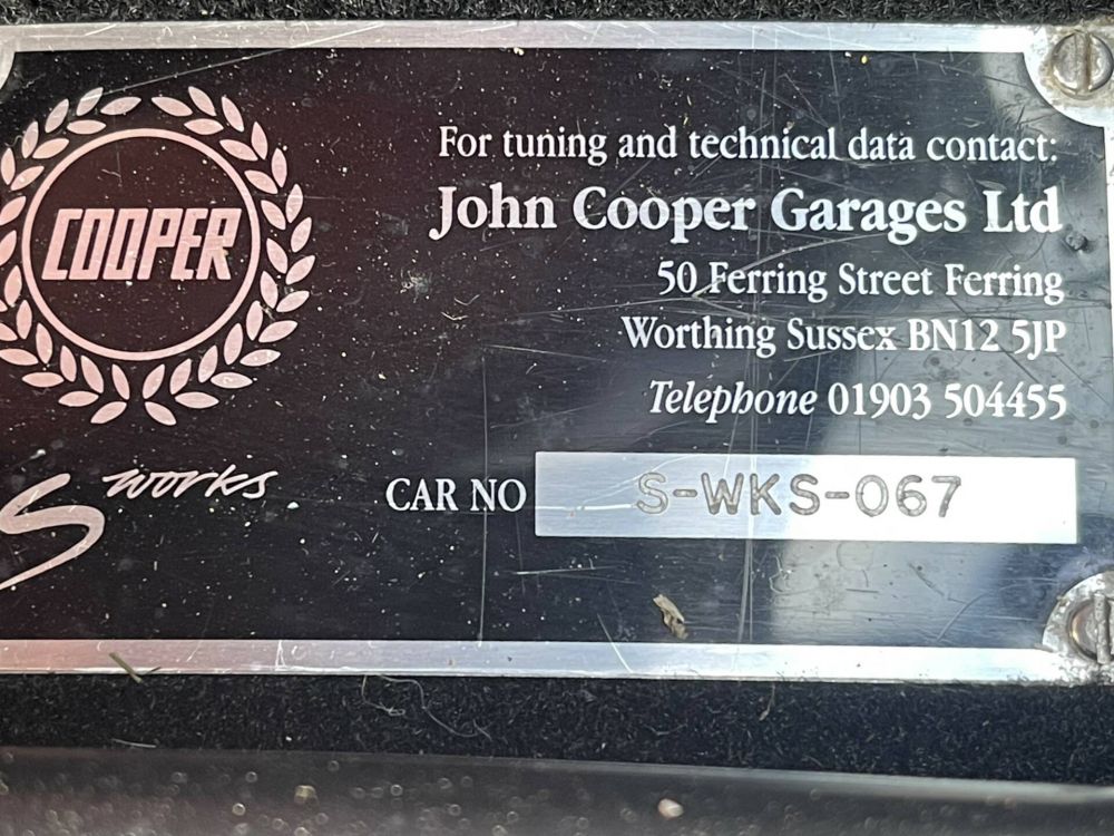 Per the John Cooper Brochure the mechanical upgrades comprise: a new, fully ported 5-stage cylinder head, polished and gas-flowed with a modified inlet manifold and larger inlet valves. Compression ratio is raised to 10.1:1 and roller rockers have been fitted. Fuel pressure has been increased and the injection and throttle bodies matched to suit. A redesigned air-cleaner is fitted to improve breathing together with a new exhaust system. The S Works commission plate is present for car - number 067.