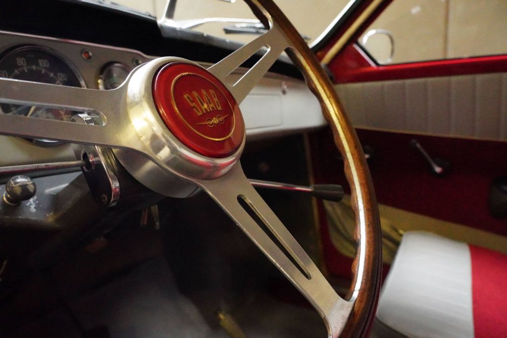 In the car we can find a number of other elements from racing team's cars. We can find special air intakes on the hood, a fan with more blades, steel Saab Sport rims, disc brakes at the front, a 4-speed gearbox, a special exhaust system and many other elements that make this two-stroke pearl one of a kind.