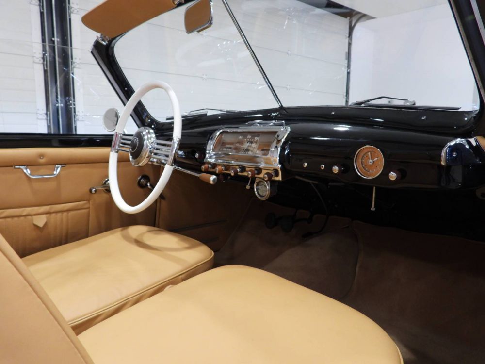Beige connoly leather seats and panels, Beige wool carpet, Original two-spoke steering wheel of the time, Rectangular instrumentation in central aluminum position, Green canvas hood, Gearbox on the steering wheel (Giraud accessory)