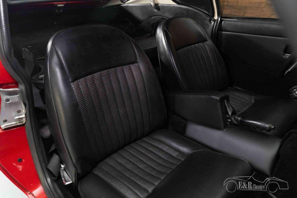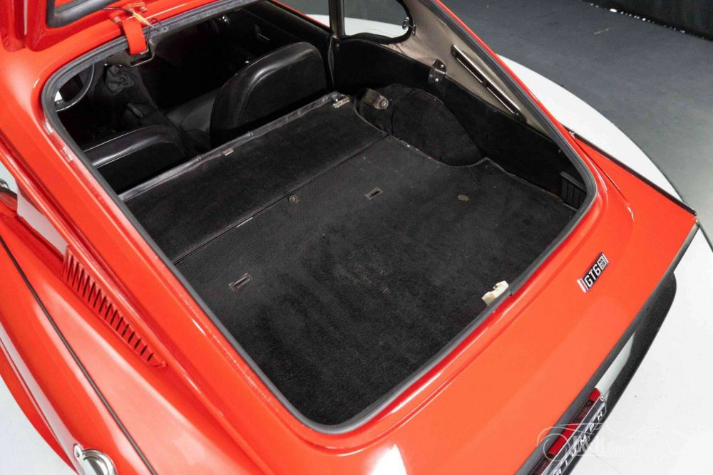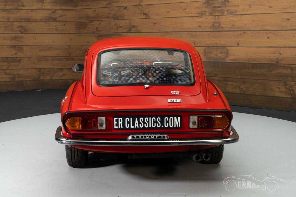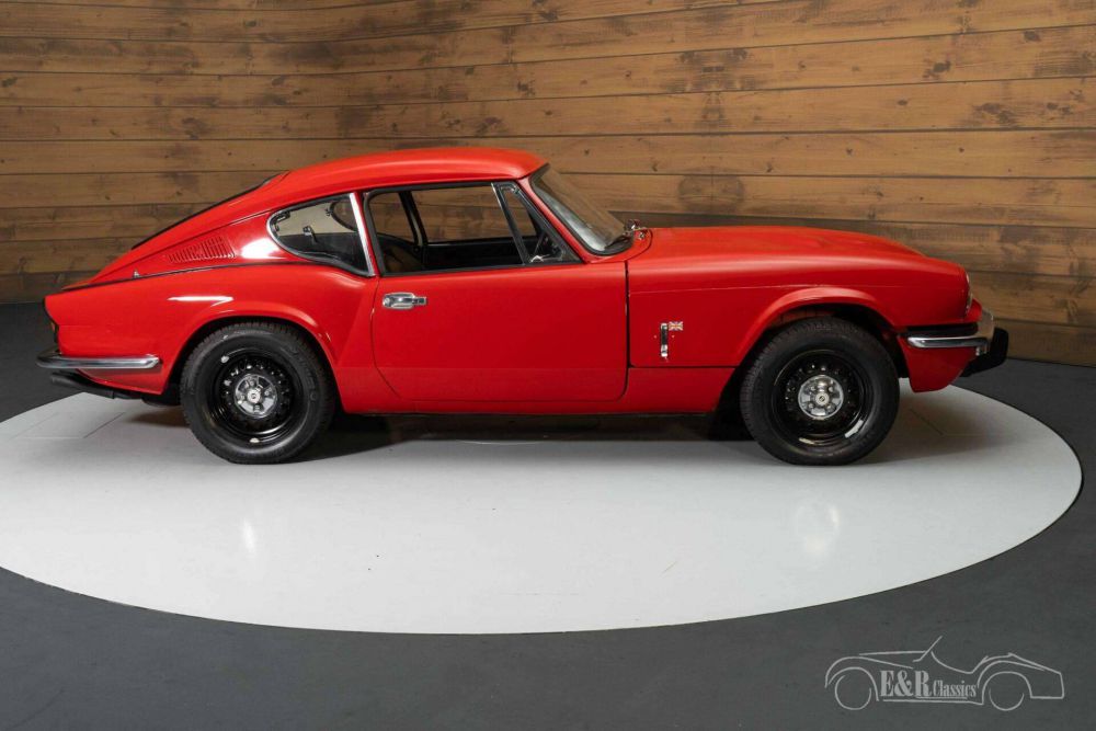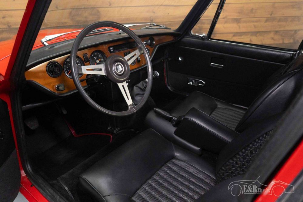 The Triumph GT6 MK3 that we offer for sale here is really a sight to behold. It has a beautiful red paint that combines very nicely with the chrome and the black wheels. The interior is in a neat condition and is equipped with black artificial leather upholstery, a wooden dashboard and a leather-covered three-spoke steering wheel.