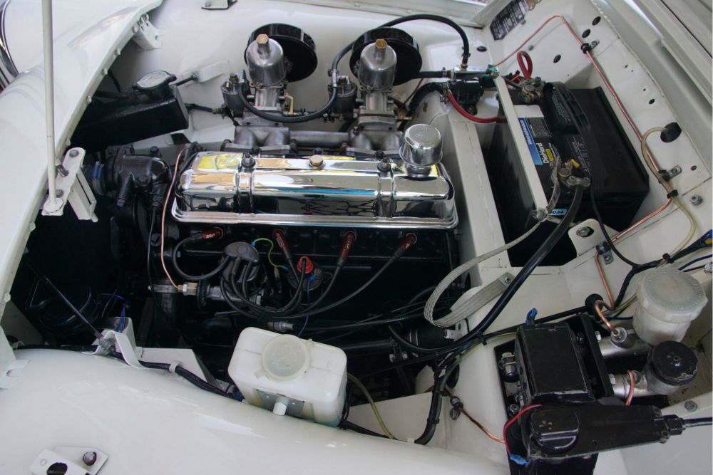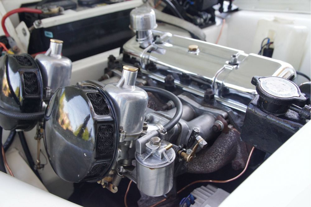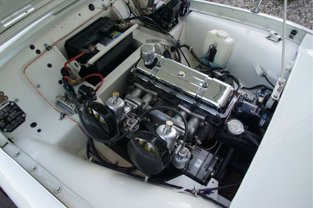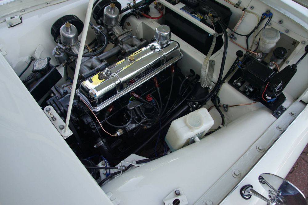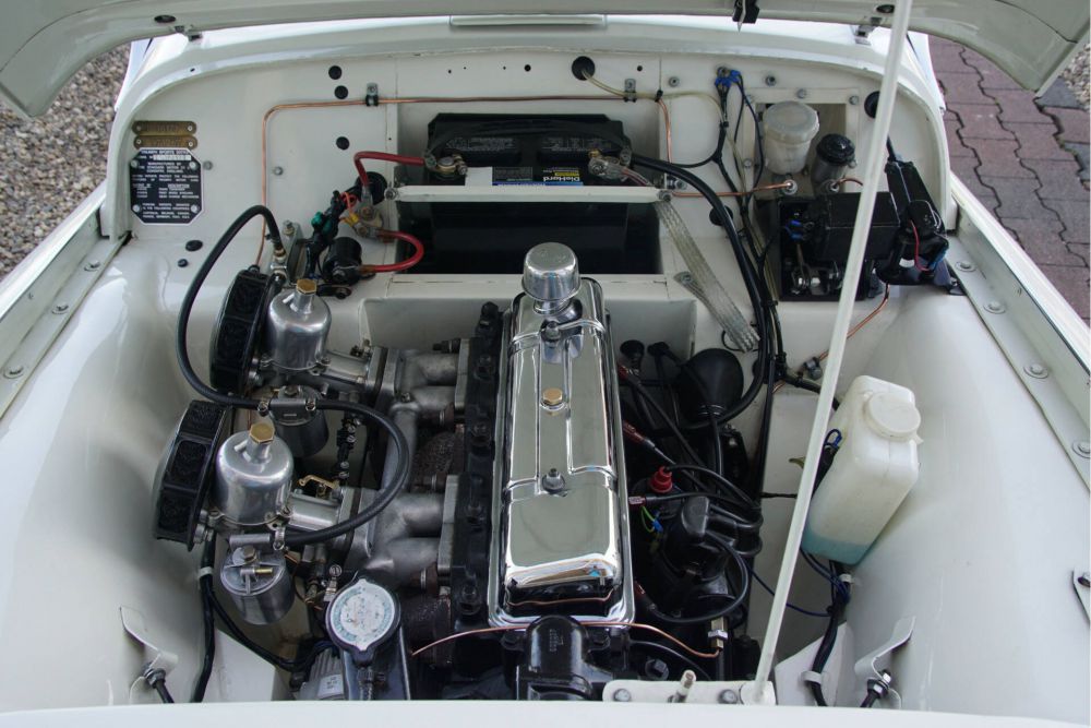 Looking at the Triumph from the outside, it is immediately apparent that its visual condition is excellent. The paintwork looks beautiful in a timeless white colour, Old English White, and the various body parts fit together very nicely. Additionally, this TR3 was originally delivered in white. The chrome bumpers and strips are in good shape as well, and the windows are in excellent condition, along with rubber parts like door and window seals. The chassis is good and solid, as is the underside. The engine bay is neat and tidy.