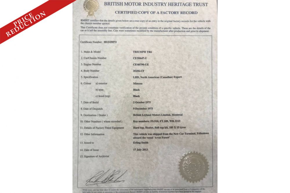 The Canadian British Leyland Motors Ltd in Montreal supplied this incredibly authentic Triumph TR6 on the 9th December 1975. This wonderful, untouched and authentic car has only covered a distance of 37,975 miles. Despite being unrestored it has withstood the ravages of time perfectly. The fine paintwork is still the one it left the factory with! The lovely bodywork is straight with factory-fresh panel gaps. It does not matter where you inspect the car, be it in the boot space, the engine bay, the sills and underneath the mats, everything is authentic and sound. It has the not often seen ‘Mimosa Yellow’ finish with black vinyl interior trim and matching hood. The hood is original with stitched reflection as is the cars interior, both in fine condition. It has its original, matching numbers engine. This TR 6 has a Heritage certificate confirm all numbers and colour specifications, the original owners manual, reserve keys and car wallet. We rarely see a TR 6 in such top quality, original condition. Words like beautiful, unique and rare spring to mind!