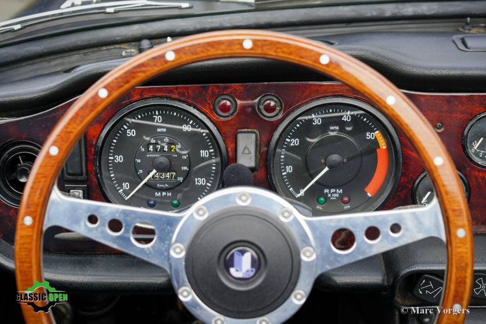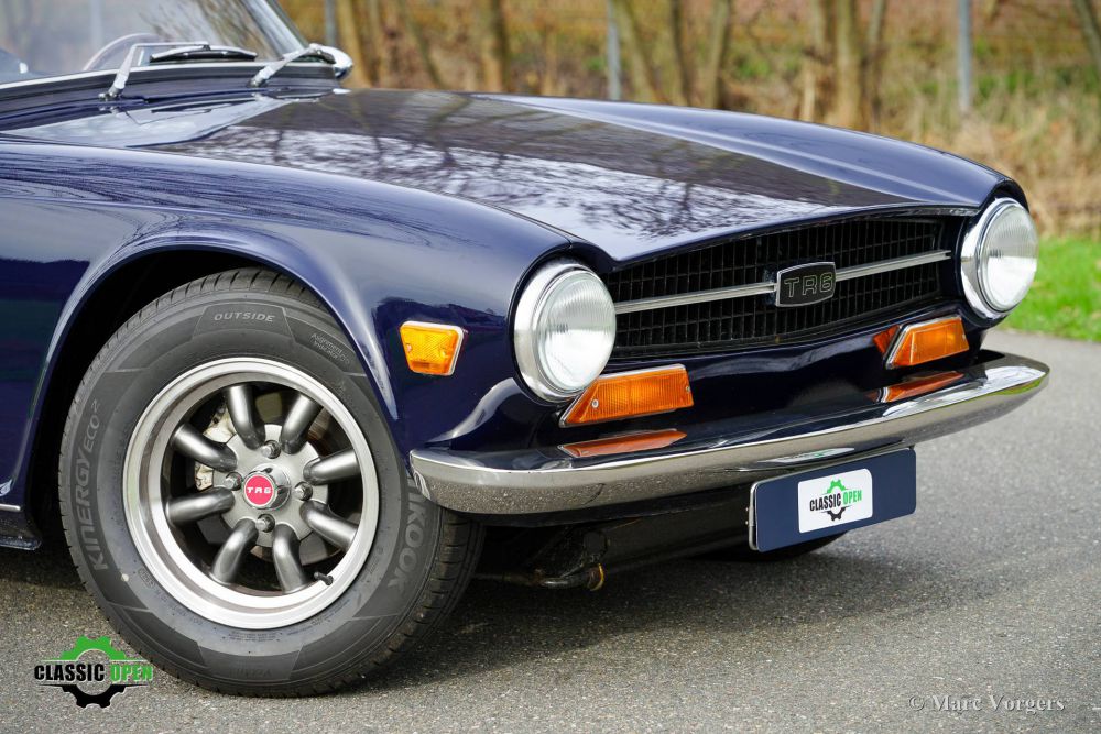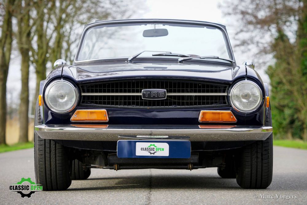 Triumph TR6, year 1971. Colour dark blue combined with a black leathercloth interior trimmed with black carpet. Black vinyl soft top and hood cover. This fantastic Triumph TR6 was sold new in the USA, and it was imported to the Netherlands in the past. This sporty roadster is in a very good condition, and the car drives perfectly. The Triumph TR6 is the last of the ‘hairy chested’ classic British roadsters featuring a long bonnet, a powerful engine with a wonderful exhaust soundtrack, and a superb open top driving experience. The reliable 2.5 Litre straight six engine runs beautifully and the gearbox with overdrive shifts with a nice solid feel to it. The interior is fitted with a walnut dashboard filled with chrome bezel gauges. This beautiful TR6 is fitted with Minilite style alloy wheels shod with wide 205/70 R15 tyres, a chrome luggage rack, and a Stainless-Steel exhaust. The exhaust, the soft top, the rear lights, and the bumpers were recently renewed. This is a delightful Triumph TR6 for the classic British sports car enthusiast, the car is ready to be enjoyed to the fullest! We speak Dutch, English , German and French. Our cars can be delivered with Dutch, German or Belgium registration. We can assist with the French registration. Transport to your door is possible. We have our own workshop facility with 30 years experience with classic cars.