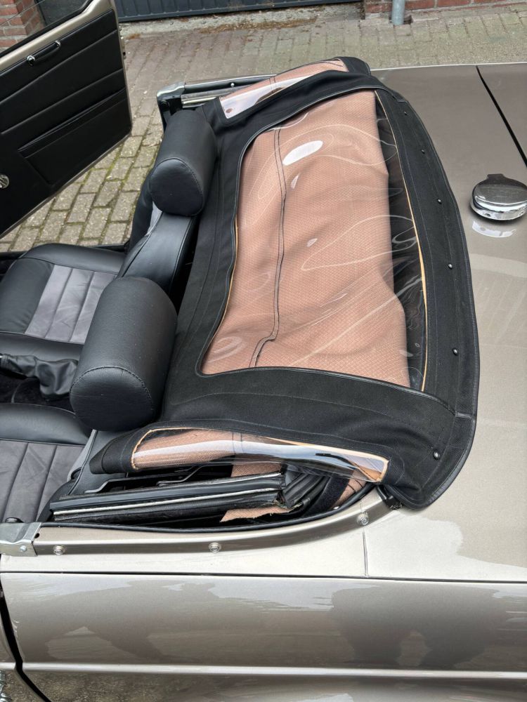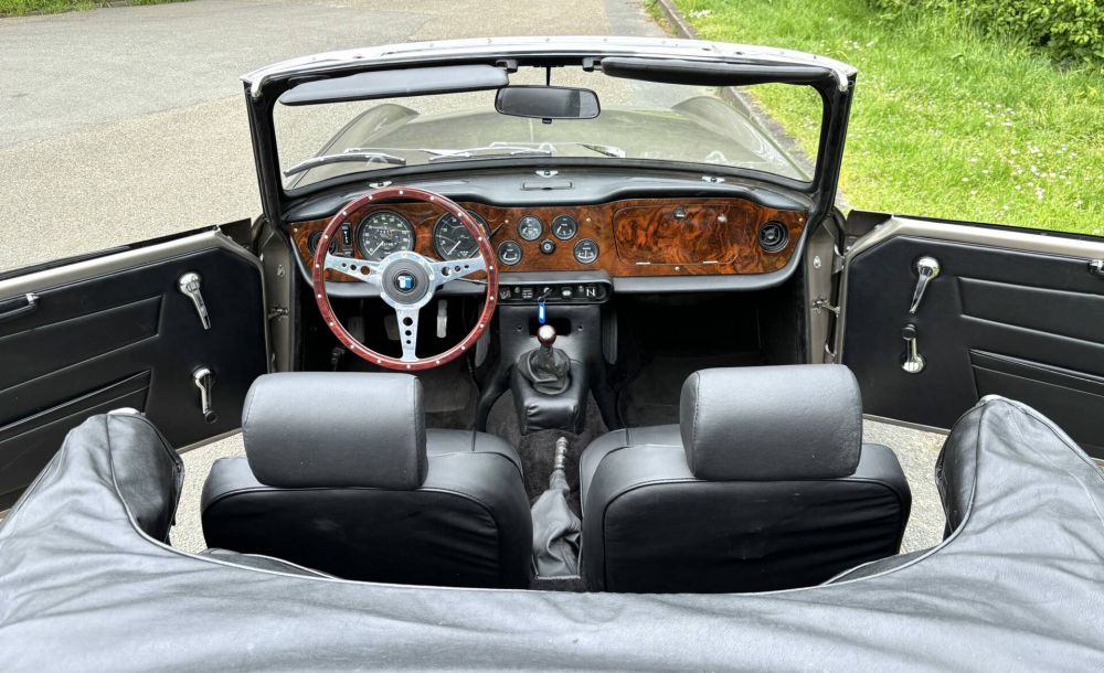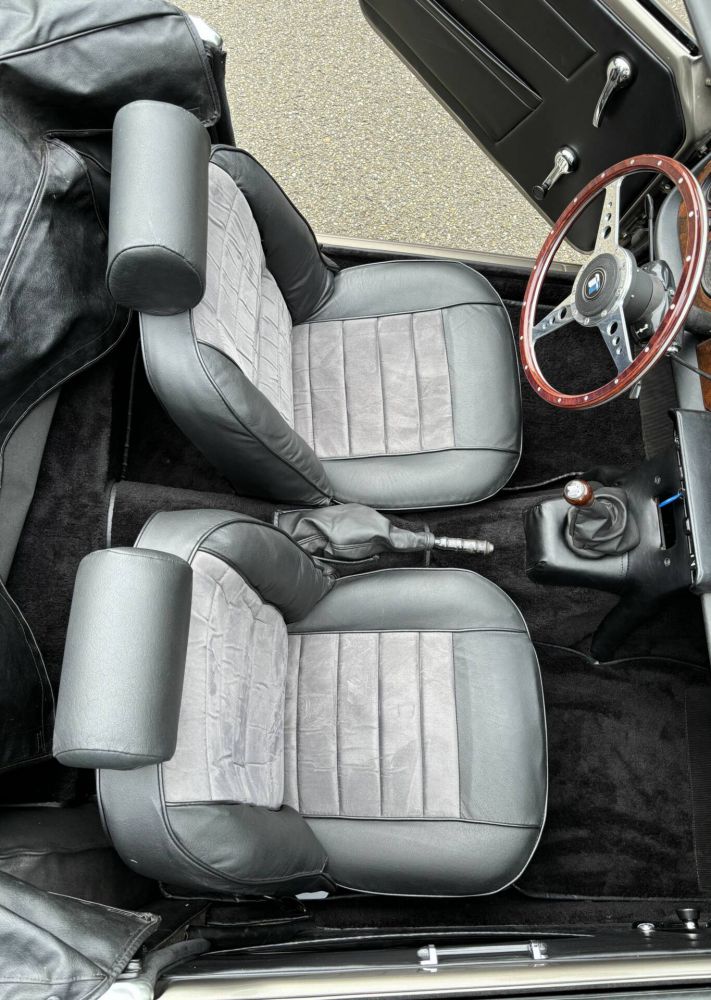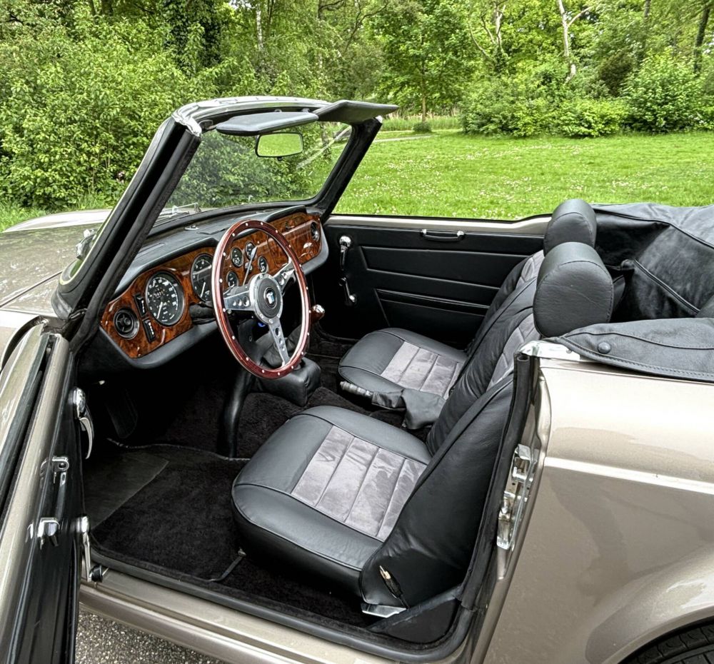 The interior is also stunning, with the dashboard newly upholstered and the counters and gauges overhauled. Very nice is also the classic Nardi steering wheel, which you hardly see anymore. New TR6 seats upholstered in real leather and alcantara have been fitted and the complete carpet set and trim panels have been renewed. The black hood was also then replaced with a beautiful and expensive mohair hood and the window is clear and scratch-free.