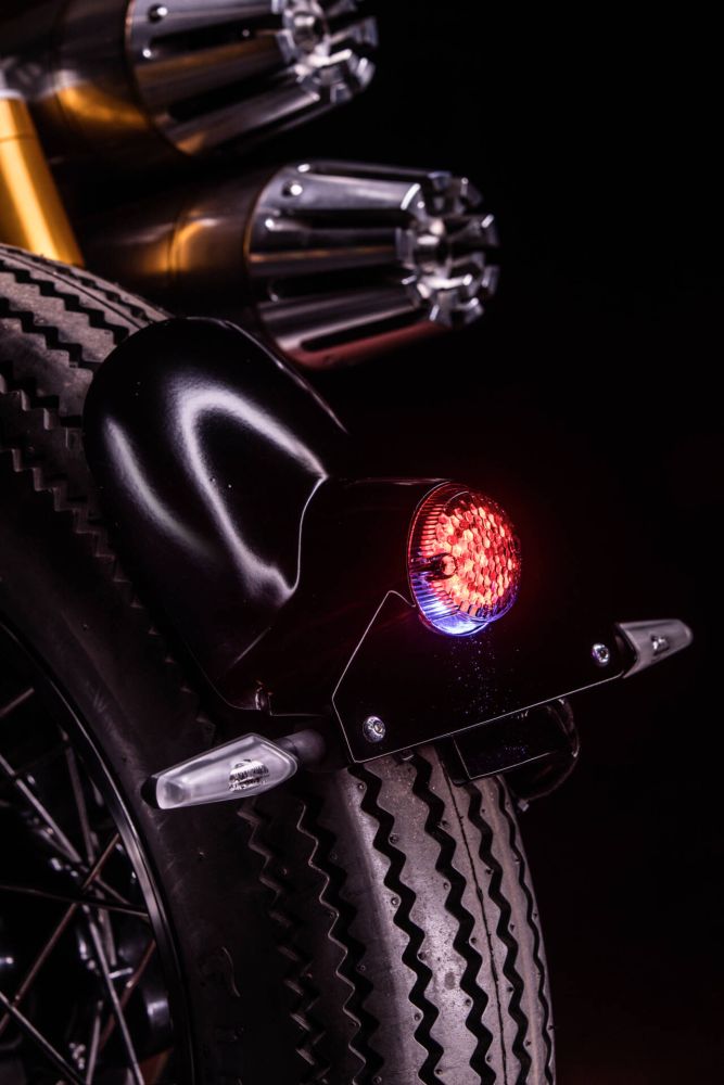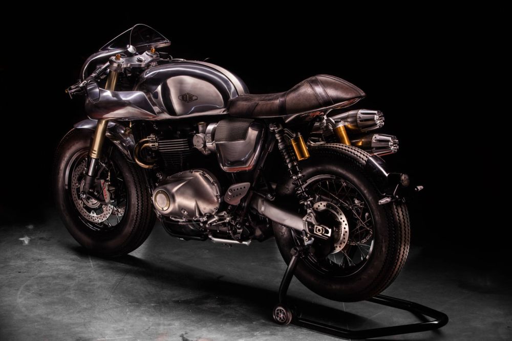 Motorcycle approved under the latest Euro 4 standard Bodywork: Custom-made aluminum (tank, front fairing, mudguards, sump guard) Handlebars: Custom-built, integrating brake master cylinder and clutch cable, with inverted controls and billet-machined switches Saddle and side covers: Redesigned Engine: Triumph 1200 cc twin-cylinder, fuel injection, liquid-cooled, borrowed from the Thruxton R Exhaust: Custom stainless steel, high-mounted with turbine-style aluminum end caps machined from solid material Front Fork: Yamaha YZF R6 Wheels: 16-inch with Firestone Deluxe 5x16 tires Front Braking System: Brembo, 4-piston calipers / 300 mm discs Headlight: LED cross-style in black