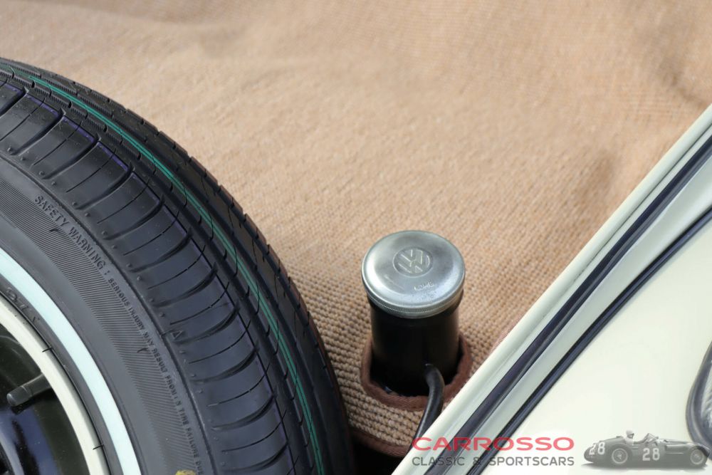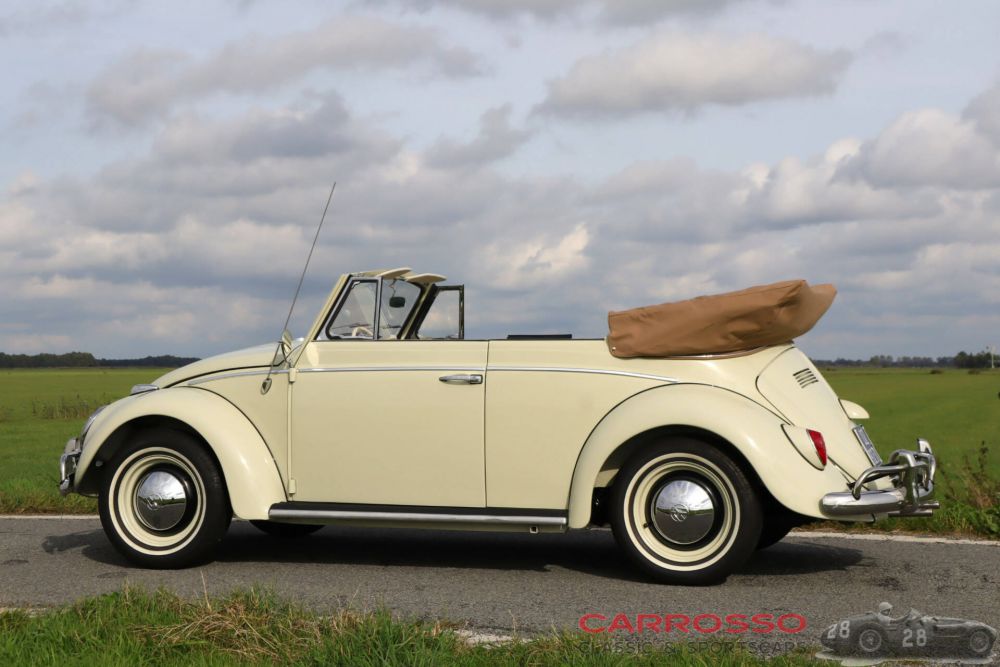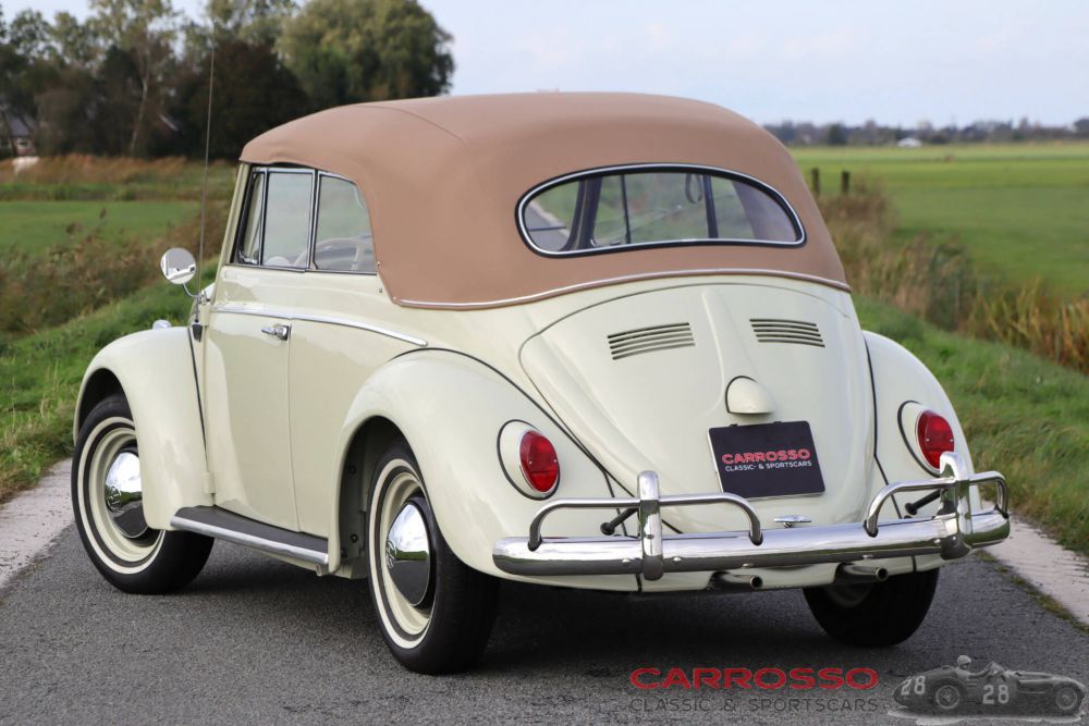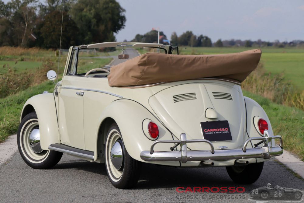 Sometimes you instantly fall in love with a car: this is certainly the case with this beautifully restored ‘Beetle’. It was built in 1963 by coachbuilder Karmann and delivered new in the United States. In 2020, the restoration was completed and the car was registered on Dutch registration plates. The restoration was carried out professionally and it shows: neither cost nor effort were spared and high-quality products and materials were used, leaving the car in excellent condition. The car has therefore been appraised at state 1, the best possible class (with an appraisal value of €75,000). The car cannot be checked for matching numbers but has been checked for originality. For example, the car originally has the swing-down rear windows (unlike many replicas). The brown convertible top has been luxuriously and exclusively manufactured by a renowned German company (KHM Cabrioverdecke). This includes a tonneau cover and cover. The colour combination of the car is stunning: pearl-white paintwork with a brown hood and beige interior. This interior has high-quality floor mats and the original, working radio. Even when driving the car, you can feel that love has been put into it: it drives and shifts superbly. A uniquely beautiful car in concours condition!