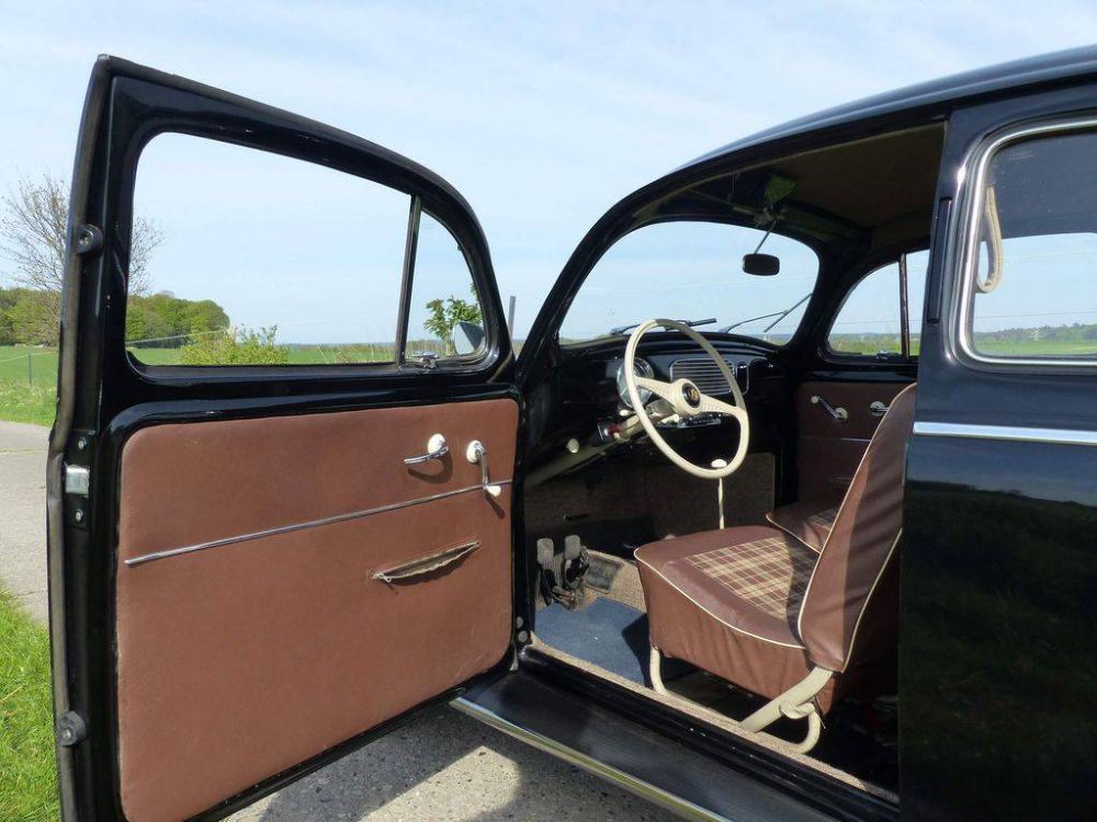 The VW “Beetle”, a design by Ferdinand Porsche in the mid-1930s, was a post-war success of unimagined dimension. Heinrich Nordhoff, then general manager of the Volkswagen factory, had the product continuously improved and recognised the might of a perfect VW service network. The export of the car, a global success, began in August 1947. From March 1953 the oval rear window was introduced, the so-called “pretzel” was a thing of the past. From January 1954, the engine was available with 22 kW/30 hp. From now on, the car is considered suitable for everyday use. Our Volkswagen Type 11 Limousine (“Ovali”) was registered in the district of Beckum/Germany on 08 November 1954. The classic car is completely original, except for the paintwork, which was once renewed in its original colour. In addition, the “Beetle” is equipped with very rare slipcovers for the seats, which could be ordered from the factory. The original fabric underneath is flawless. The mileage of 29,000 km is plausible considering the condition of the car. There is only one entry in the original cardboard motor vehicle registration certificate! This classic brings back memories of childhood for many people.