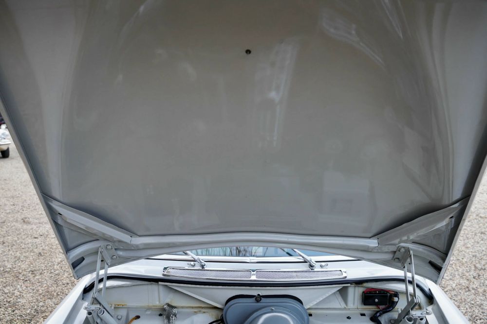 The bodywork is beautifully preserved, with glossy paint and pristine chrome detailing. The car has been professionally repainted, enhancing its already fantastic presence. The two-tone color combination, together with chrome hubcaps and red accents, makes for an extremely stylish classic. The windows are in great condition, and the correct chrome trim completes the elegant look.