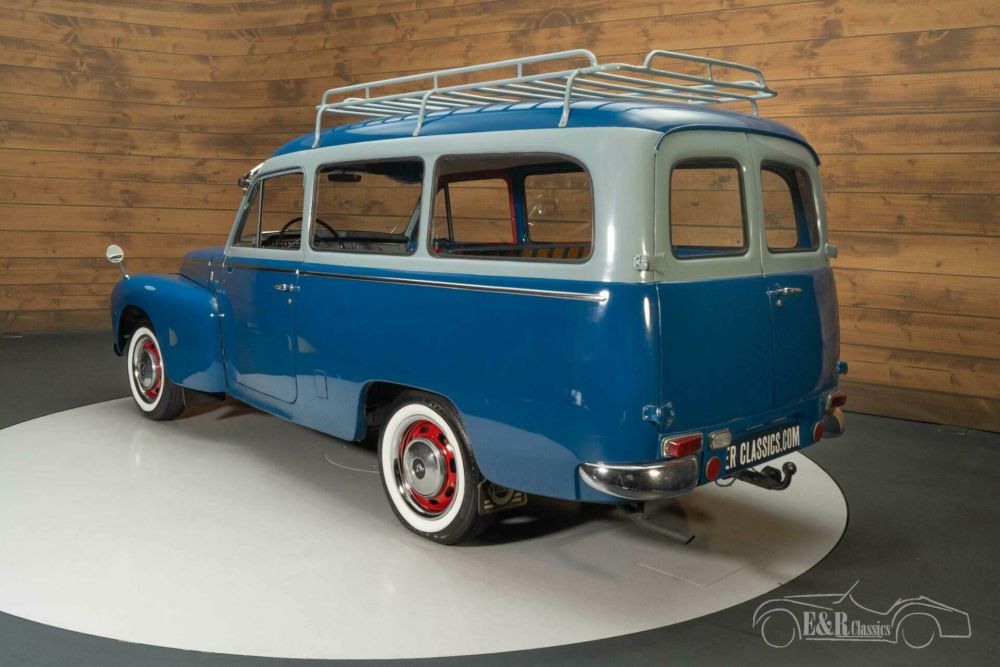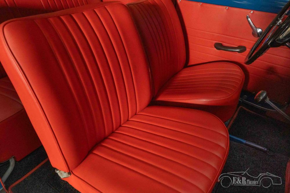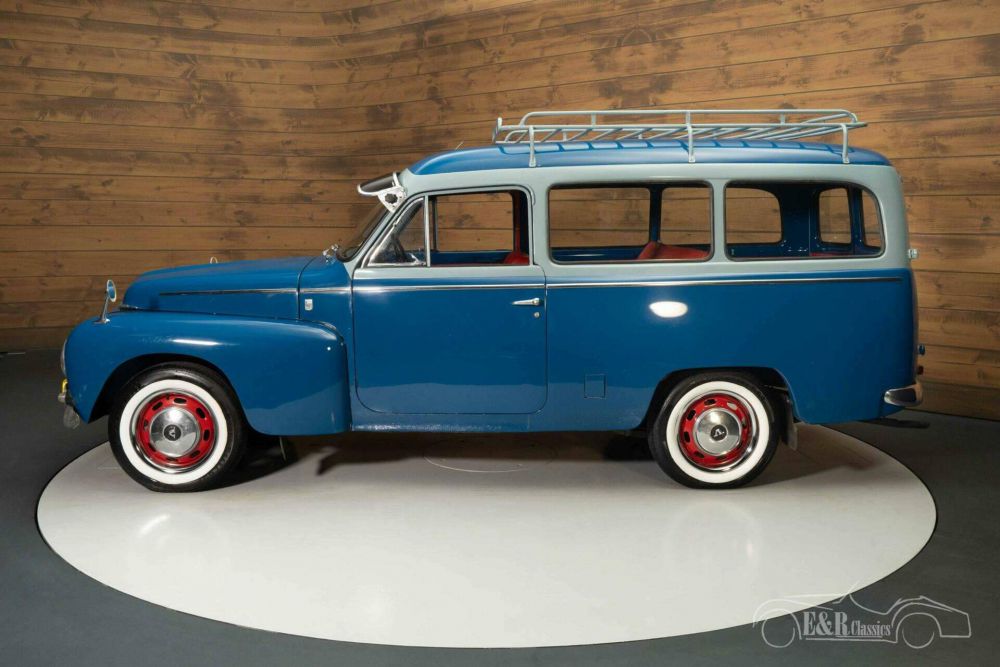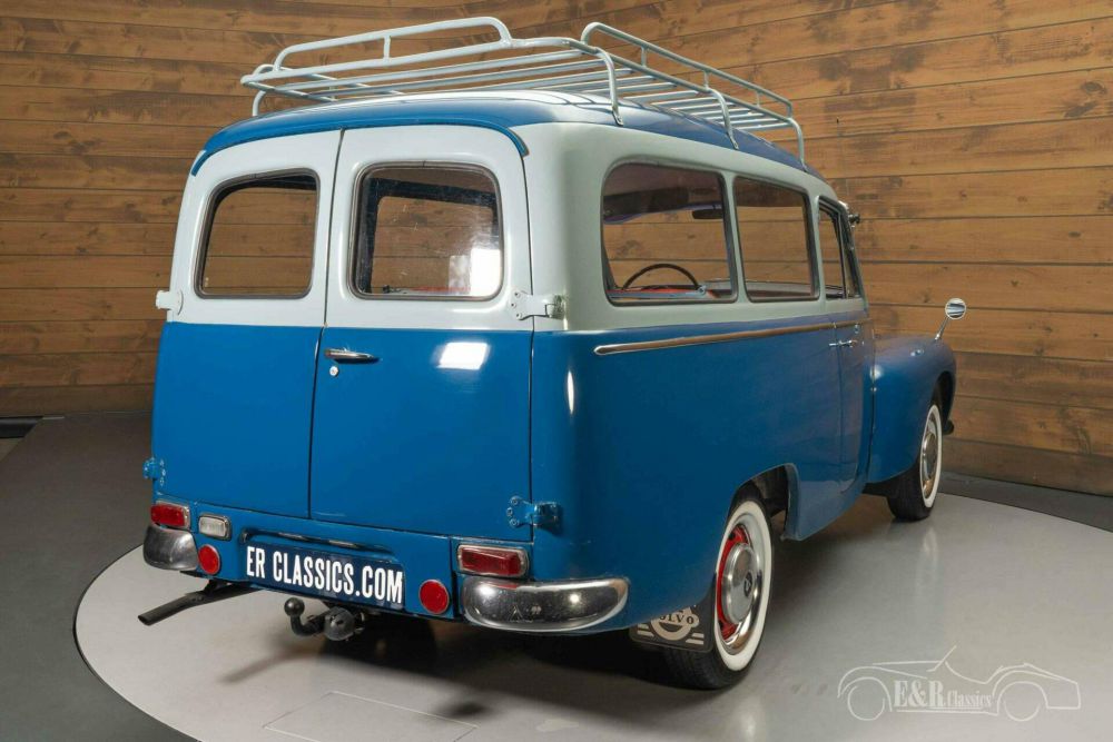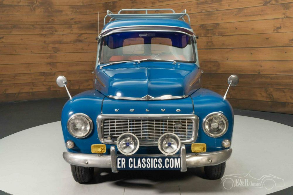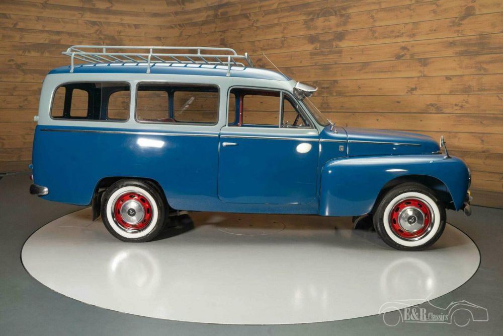 The Volvo Duett that we offer for sale here is really a picture to behold. It is finished in a two-tone blue paintwork that completely suits this 60s classic. The Volvo is also equipped with some nice extras such as a roof rack, sun visor, bumper mirrors, extra spotlights and white walls. The red interior of the Duett pops out and combines very nicely with the blue paintwork. The loading platform is covered and inlaid with wood.