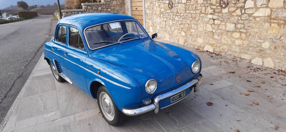 Nel 1958, venne siglata l'alleanza fra Renault e Alfa Romeo per la produzione della Dauphine nello stabilimento del Portello con il marchio del Biscione. La vettura che presentiamo è una delle 6500 vetture prodotte nel 1959, esattamente il 17 ottobre 1959, come da consultazione dei registri di produzione presso il Centro Documentazione Alfa Romeo, con vendita il 24 ottobre e consegna targhe originali BS e garanzia dal 26 ottobre 1959. La vettura venne acquistata da una 37 enne che ne fece sempre un uso limitato all’ambito cittadino e sempre parcheggiata in garage. La vettura ha in dotazione: contratto di acquisto e fattura, libretto di garanzia e tagliandi, depliant della vettura, targhe e libretto aggiornato nel 1971 per cambio residenza. Nella seconda metà degli anni ’70, venne ritirata dall’allora nostra Concessionaria Renault in permuta su una nuova R5. Da allora è rimasta in Concessionaria fino al 2016, quando fummo invitati a cederla ad un appassionato di Brescia, che gestiva un distributore di carburante. Egli fece richiesta dell’Attestato ASI e CRS. Ceduto il distributore, non sapendo dove tenerla, ci ha riproposto l’acquisto. Noi abbiamo proceduto alla richiesta del Certificato di Origine Alfa Romeo  il quale ha confermato trattarsi di vettura  matching number e matching color. Inoltre abbiamo proceduto ad un maxi tagliando (con relativa documentazione), per metterla in ottima efficienza. Oggi possiamo certificare una vettura che consente di viaggiare con piede appena puntato a 90 km orari, con il volante stabile e dritto, con una frenata corretta, con un cambio senza giochi e con tutti i sistemi di strumentazione e servizi funzionanti. Come diceva la pubblicità dell’epoca: “La guidate con un dito la comandate con un piede!” Una simpatica ed onesta vettura, che ti trasporta non solo con facilità ma, con una “potente” macchina del tempo, ti conduce nei favolosi anni’60 con una pagina di storia, documentata non facilmente recuperabile. Una vettura che come tutte le cose, deve piacere, e se piace, può dare molte soddisfazione all’appassionato, attento ai dettagli.