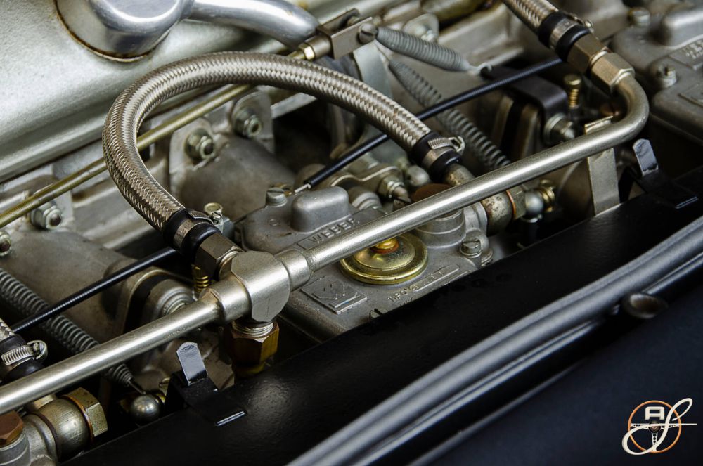 Nuestra unidad, que ha sido restaurada en su totalidad en nuestras instalaciones, incluye una potenciación de motor a especificaciones Vantage. Así, sus tres carburadores Webber de doble cuerpo extraen ahora del 6 cilindros en línea de 4 litros, la respetable cifra de 330cv, suficientes para convertirlo en uno de los GT más rápido de la década de los sesenta.