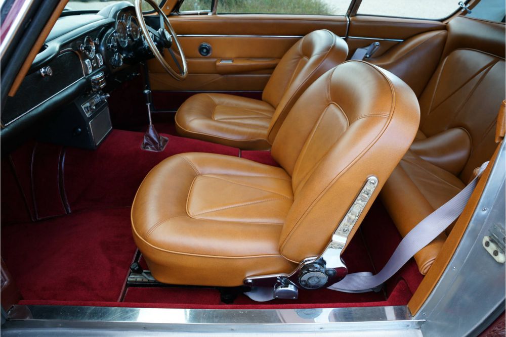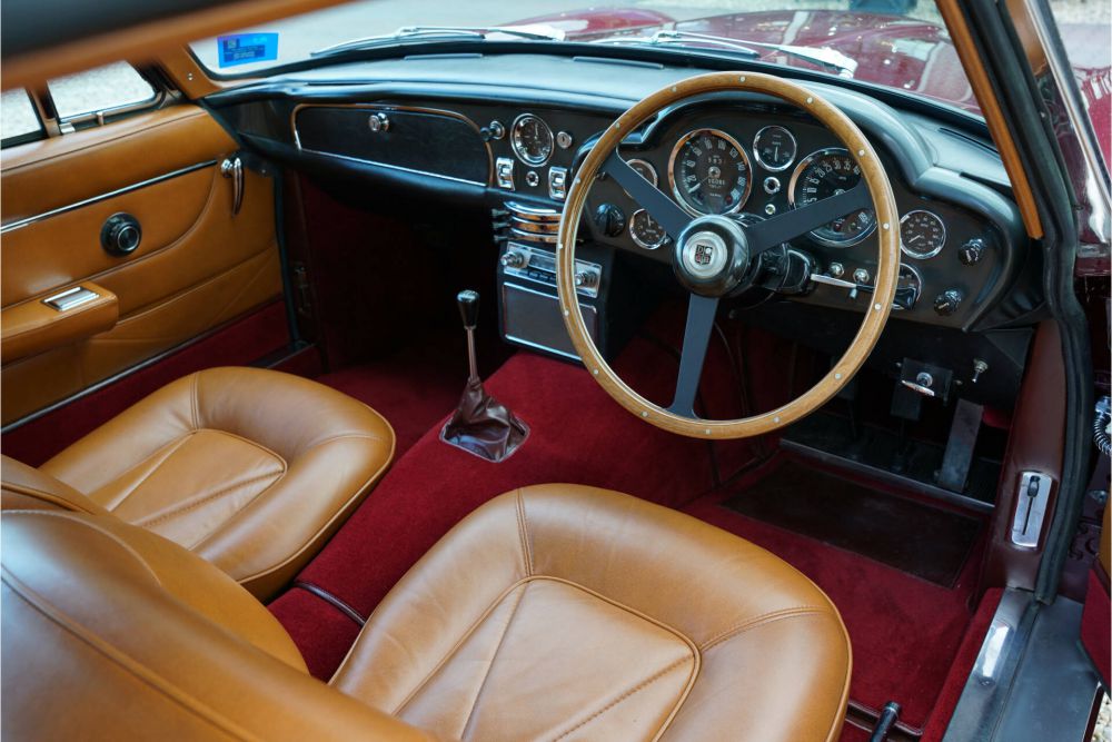 Inside, we find beautiful leather upholstery, which forms a very chic combination with the exterior. The red carpets, along with the rest of the interior, are in marvellous condition. The exquisite gauges, along with the dashboard and switches, look beautifully maintained. The red carpets are a feast for the eyes, the colour combination of this DB6 is simply stunning!
