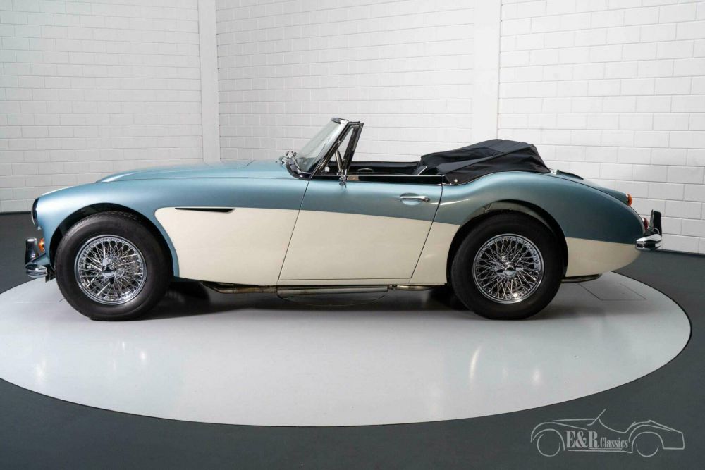 Deze Austin-Healey ziet eruit zoals een Healey eruit hoort te zien: een two-tone Ice Blue/Old English White lakwerk. Een kleur die helemaal past bij de Austin-Healey en nog eens extra zijn prachtige lijnen benadrukt. Het chroomwerk knalt eruit en samen met de chromen spaakwielen maakt het een echte eyecatcher van deze klassieker. Het interieur van deze klassieker verkeert in een zeer mooie staat en is uitgerust met donkerblauwe bekleding met witte piping. Hij beschikt tevens over een houten sportstuur, houten dashboard en periodecorrecte radio. Om het geheel af te maken is er gekozen voor een donkerblauwe soft top die prachtig combineert met het lakwerk en interieur.