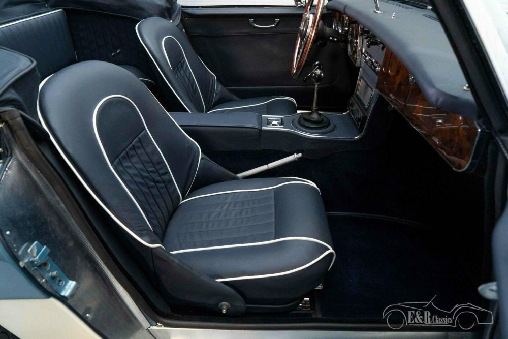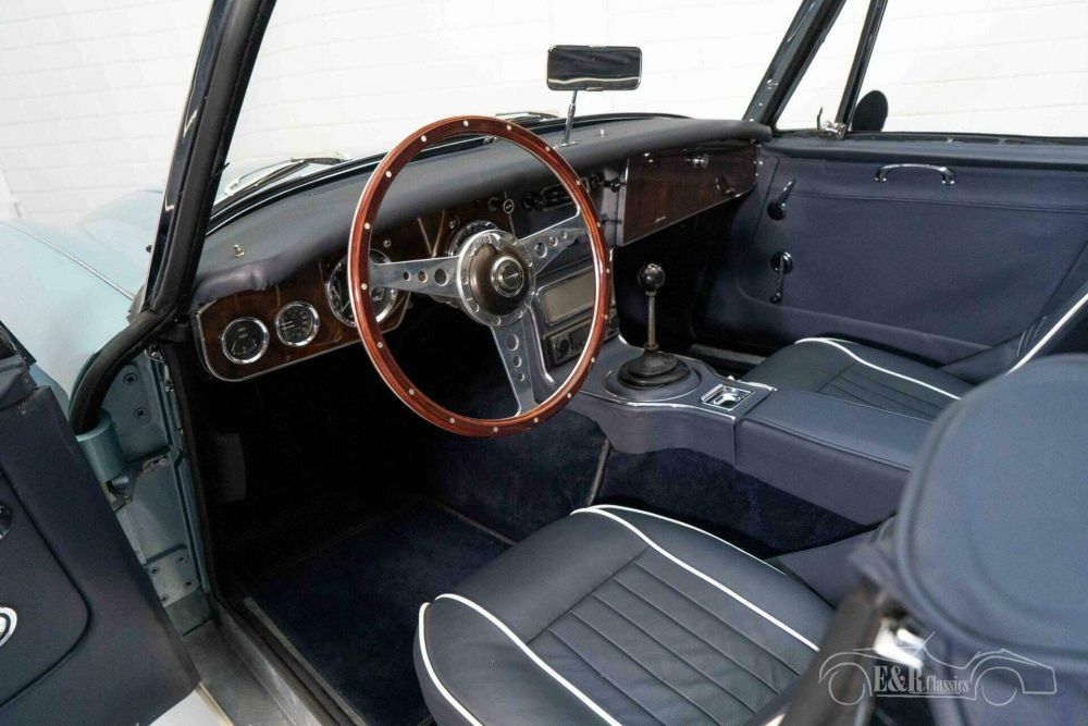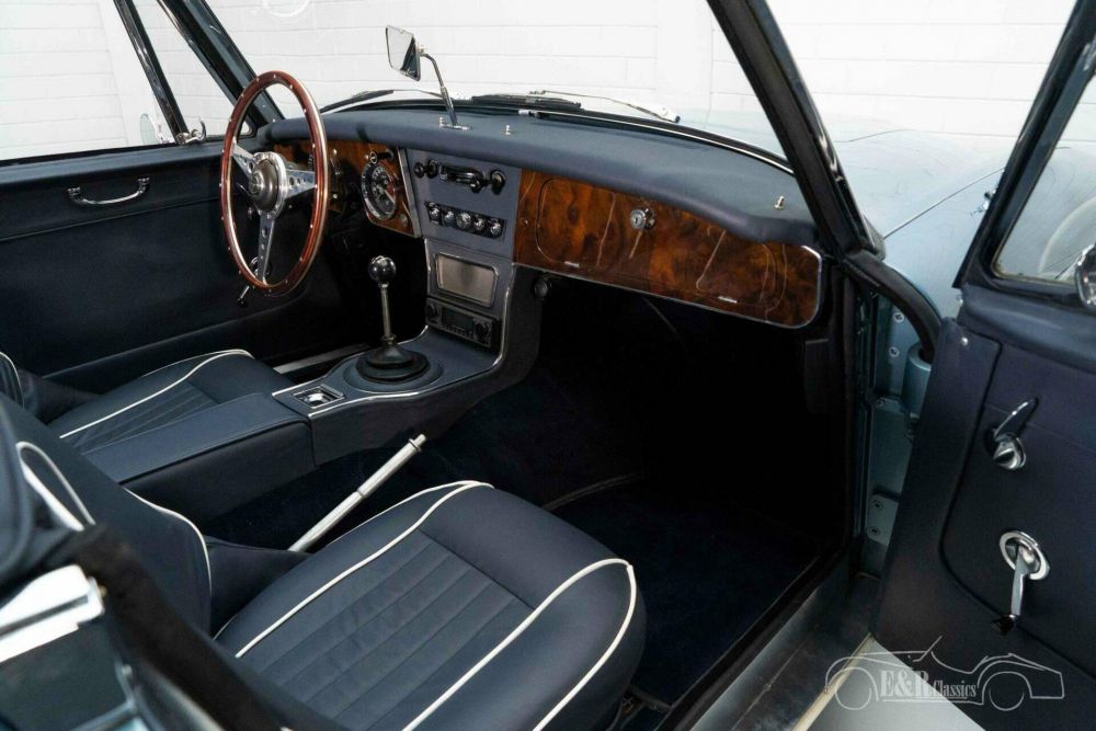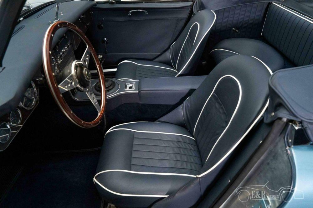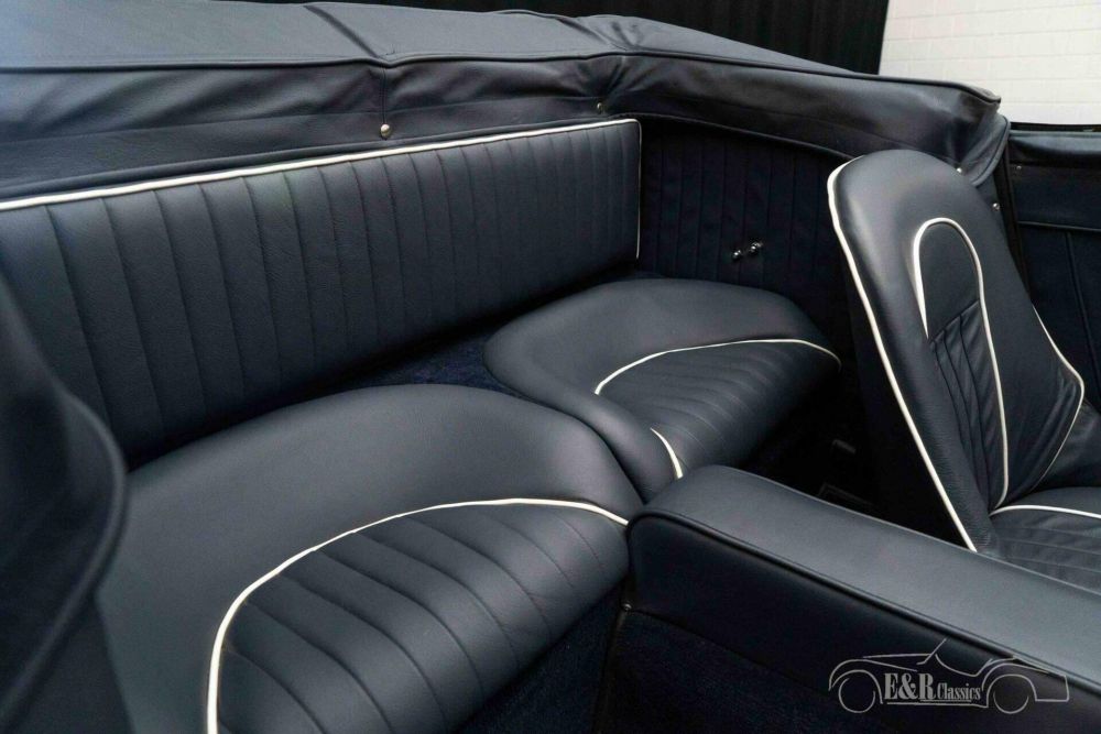 This Austin-Healey looks like a Healey should look: a two-tone Ice Blue/Old English White paint. A color that fits perfectly with the Austin-Healey and emphasizes its beautiful lines even more. The chrome work pops out and together with the chrome wire wheels it makes a real eye-catcher of this classic. The interior of this classic is in a very nice condition and is equipped with dark blue upholstery with white piping. It also has a wooden sports steering wheel, wooden dashboard and period correct radio. To finish it all off, a dark blue soft top has been chosen that combines beautifully with the paintwork and interior.