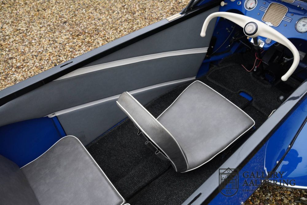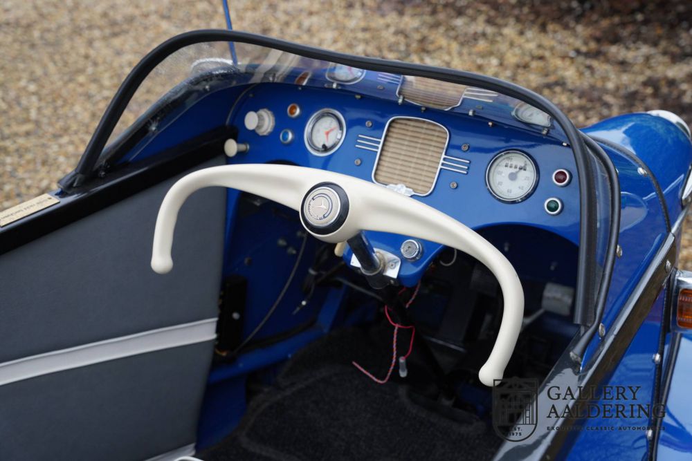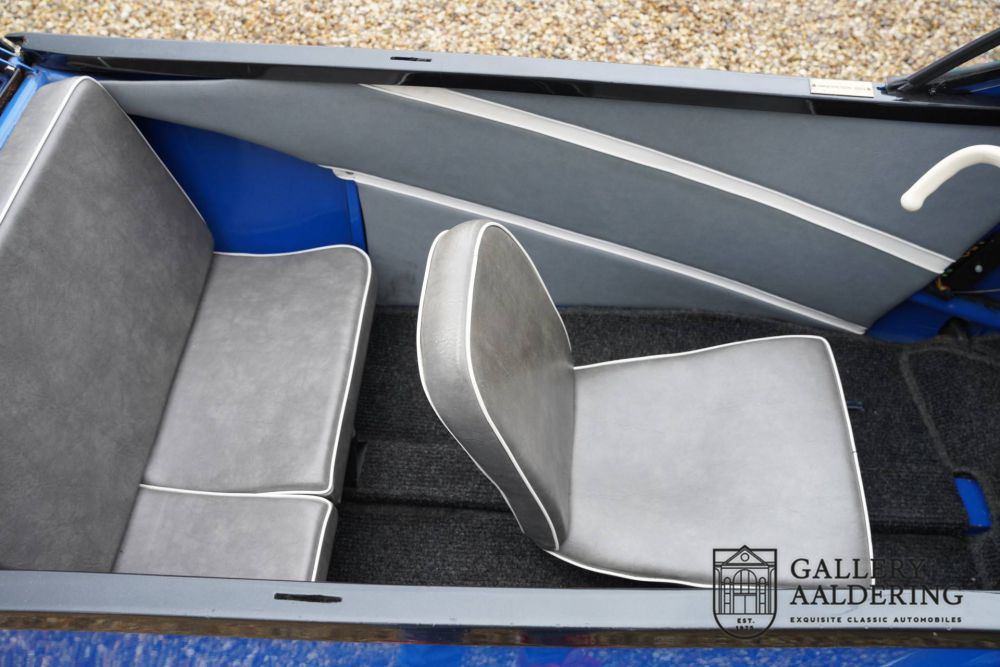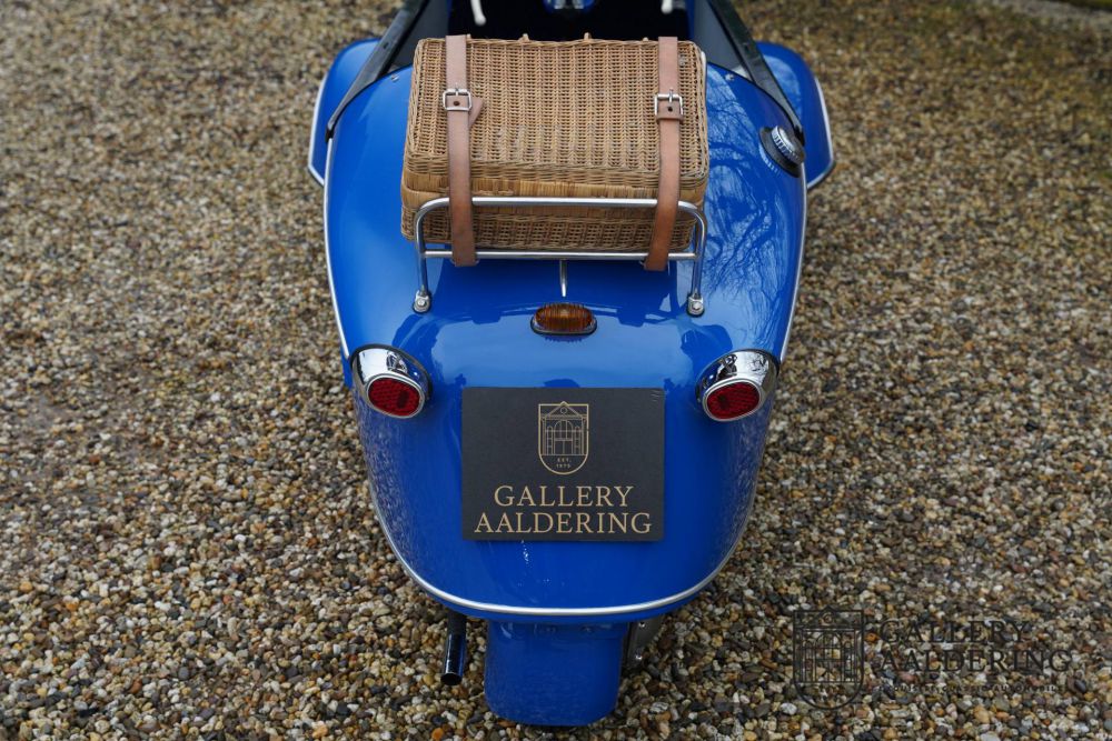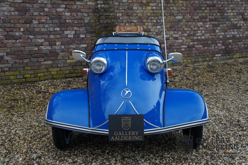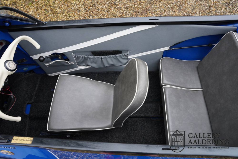 This blue KR200 presented here was the subject of a full restoration some time ago, using only the correct, original parts. Following this top-notch restoration this Messerschmitt was barely used, which explains this open two-seater’s current museum grade condition. Paintwork, panelwork and stainless steel strips, little bumpers, rubber moulding and the luggage rack with straw suitcase are all peerless. The KR200 features the correct 8” wheels with white-wall tyres.