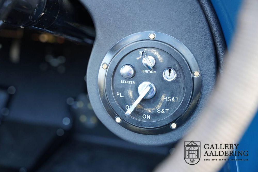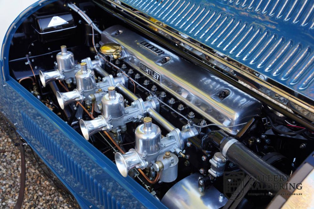 This car has a beautiful blue finish, not the expected British Racing Green but none the less a colour that wholly suits this car. Just how particularly beautiful this car is was exemplified b y winning a first in two categories at the German Tegernsee Concours d’elegance. The chassis has been strengthened to hold the gigantic Bentley B80 5,675 cc eight-cylinder. Lubrication happens by means of a wet sump and fuel is pumped through four SU H.6 carburettors. Fuelling is either via a mechanical or twin electric engine. The 4-speed and 1-reverse gearbox is fully syncro-meshed. The enormous speed can be dissipated through the hydraulic front drum brakes and rear mechanical drum brakes, assisted by a mechanical servo.