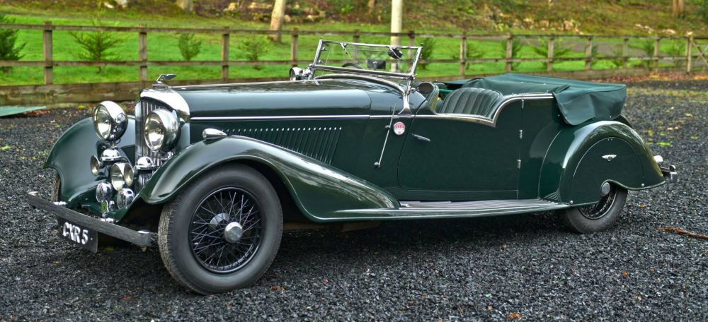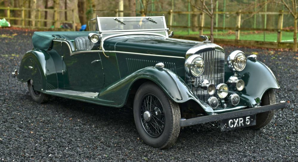 1936 Bentley 4¼-Litre Vanden Plas Tourer Chassis number: B200GA Registration number: CXR5 First registered to Sir Norman Watson Bt, to whom it was delivered on 4th June 1936, this particularly stylish Derby Bentley on the 4¼-Litre chassis has been clothed in well-proportioned open touring coachwork in the style of the rare and desirable tourer by Vanden Plas. Boasting distinctive period features including polished aluminium dashboard, cut-away rear wheel spats and polished Ace wheel discs, this car is a splendid example of a type favoured by the motoring élite of its day, Prince Bira, Malcolm Campbell, Captain George Eyston and Raymond Mays all being devotees. The car is finished in smart British Racing Green colours with a matching green leather interior. Full weather equipent also comes with the car. Mechanically the car is very very strong with one of the best & most powerful Derby engines I have yet to experience. Clearly it has had substantial works done to it in the recent past.