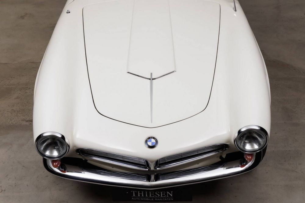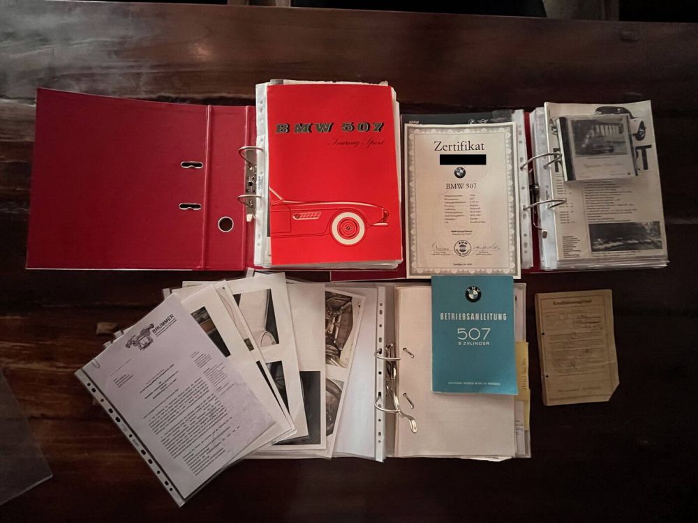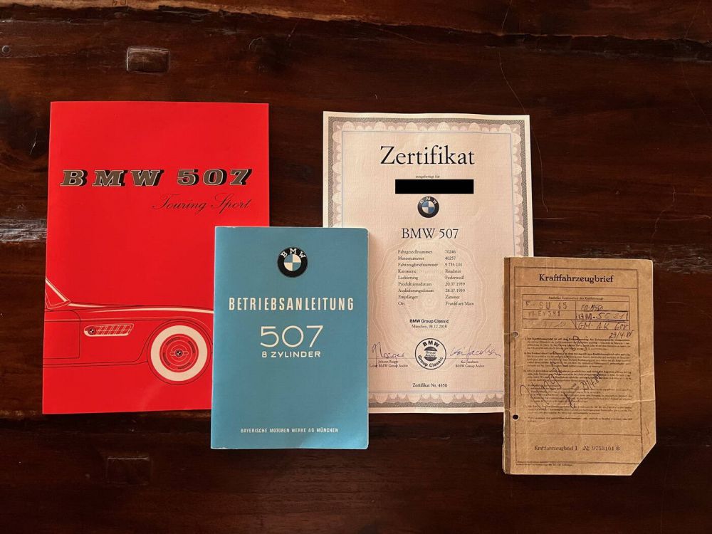 The vehicle presented here is one of the last examples built and, according to the BMW certificate and original registration document (“Pappdeckelbrief”), it was delivered to its first owner in Frankfurt in 1959 in the colour featherwhite. The vehicle was delivered from the factory with disc brakes and central locking wheels. The current owner acquired the car in July 1973. Around 25 years ago, the vehicle was completely restored by the renowned BMW 507 specialist Erwin Brummer through the mediation of BMW AG in accordance with the documentation provided.