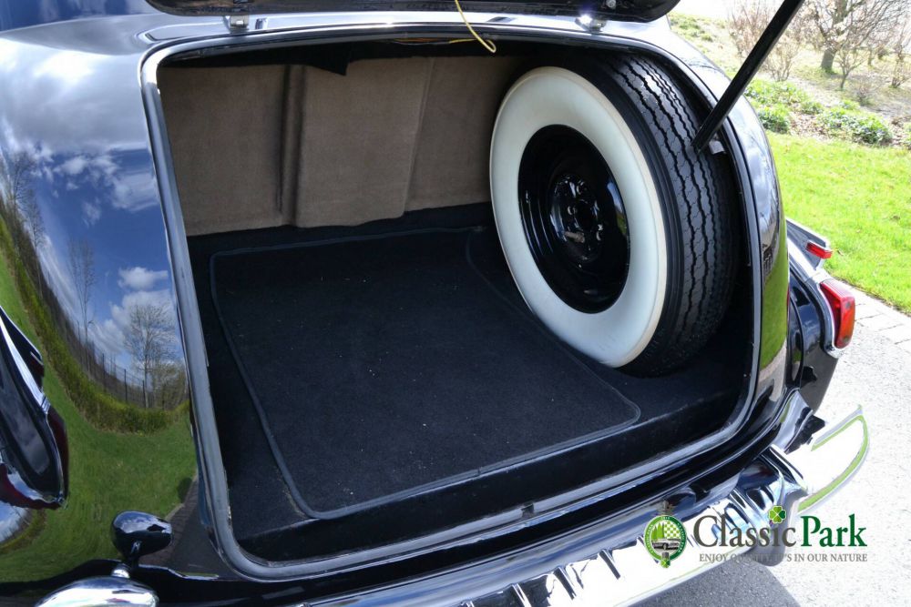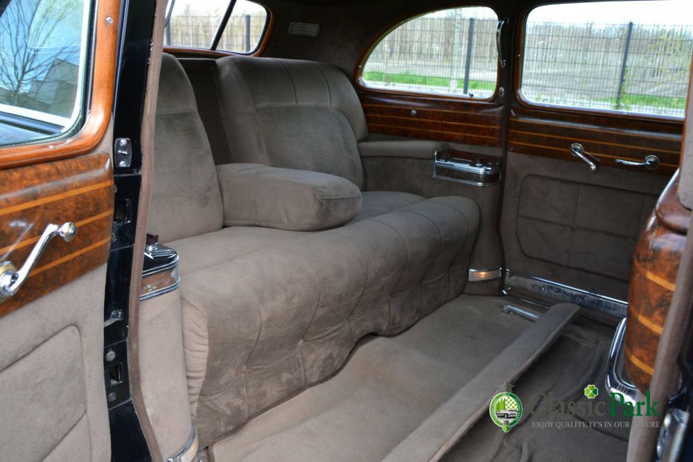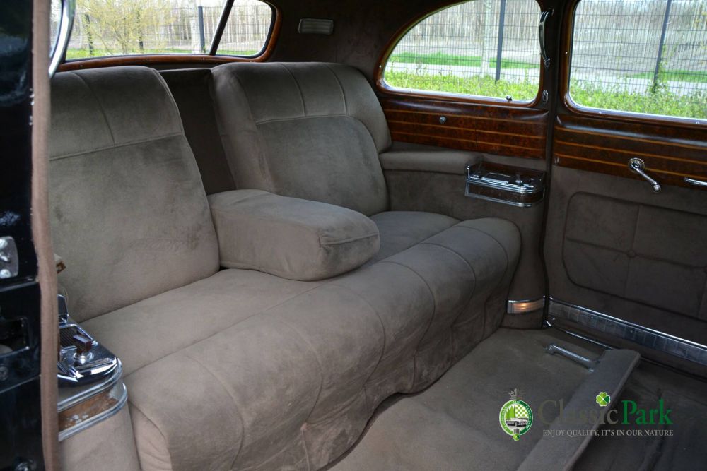 The driver and front passenger sit on a black leather-covered bench seat and the five passengers in the rear compartment stay in a brown fabric-covered compartment with a comfortable three-seater sofa and two folding seats. Between these compartments the car is equipped with an electrically operated, glass division. The spare wheel is housed in a spacious trunk, with still plenty of room for suitcases and bags remaining.