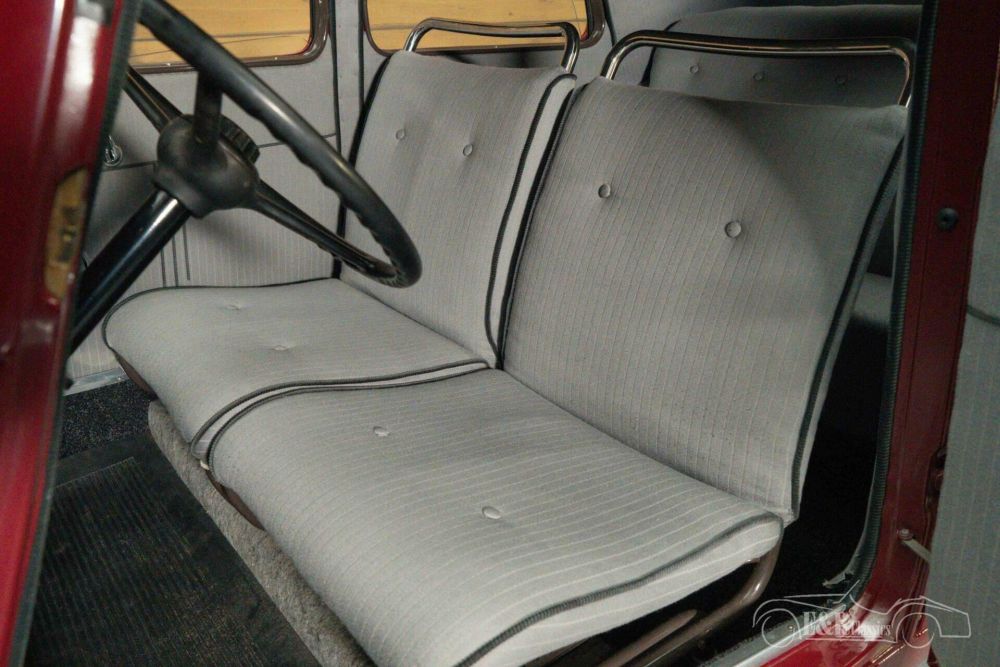 The exterior of this Traction Avant is a feast for the eyes. The deep red paint combined with black mudguards and wheels provides an elegant appearance. This model has some rare features, such as headlamp supports without adjustment holes, a three-piece spare wheel cover and bumper supports with only one bolt instead of two. The authentic petrol tank with two filler caps and the number plate with lighting (Plaque de Police) underline the original details. Inside, the interior exudes pure class, with two dashboard compartments, an original central instrumentation and a specially made interior mirror. In addition, the expansion compass for the window is still original, a detail that is rarely found. The high-quality upholstery, woven according to the traditional French method, ensures a perfect match with the exterior.