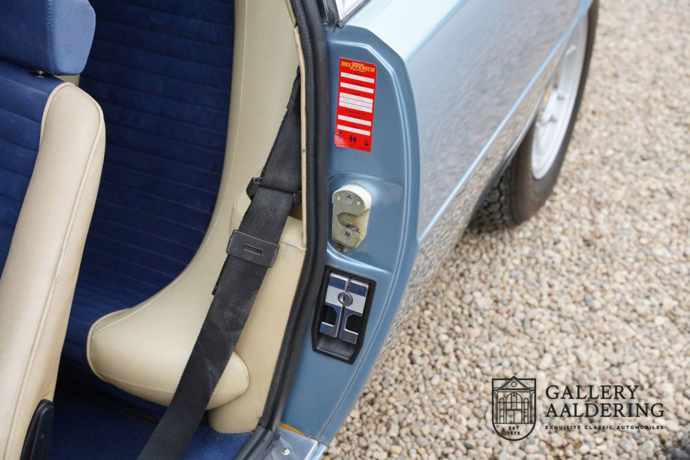 A look inside does not meet us with any unpleasant surprises. The more or less original upholstery is in an admirable condition, with the blue centre pieces perfectly matching the original blue carpets. It all has a typical 70’s atmosphere. The fully functioning dashboard looks lovely, decked with its many gauges and instruments. All of the switching gear is also in great working order with many of them seated on the dashboard and those Ferrari could not fit there housed on the middle console, where we also find the original factory-fitted Borletti air-conditioning.