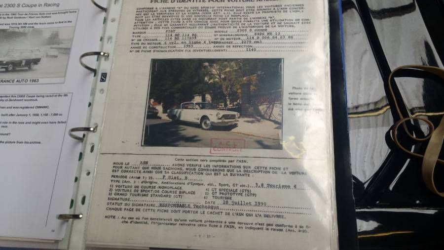 A large history file accompanies the car, which includes a copy of the French Carte Gris, FIA registration papers, engine performance reports, invoices, owners manuals, part lists, and period racing reports for the Fiat 2300S. The car is also provided with a quantity of spare parts, including a second engine.