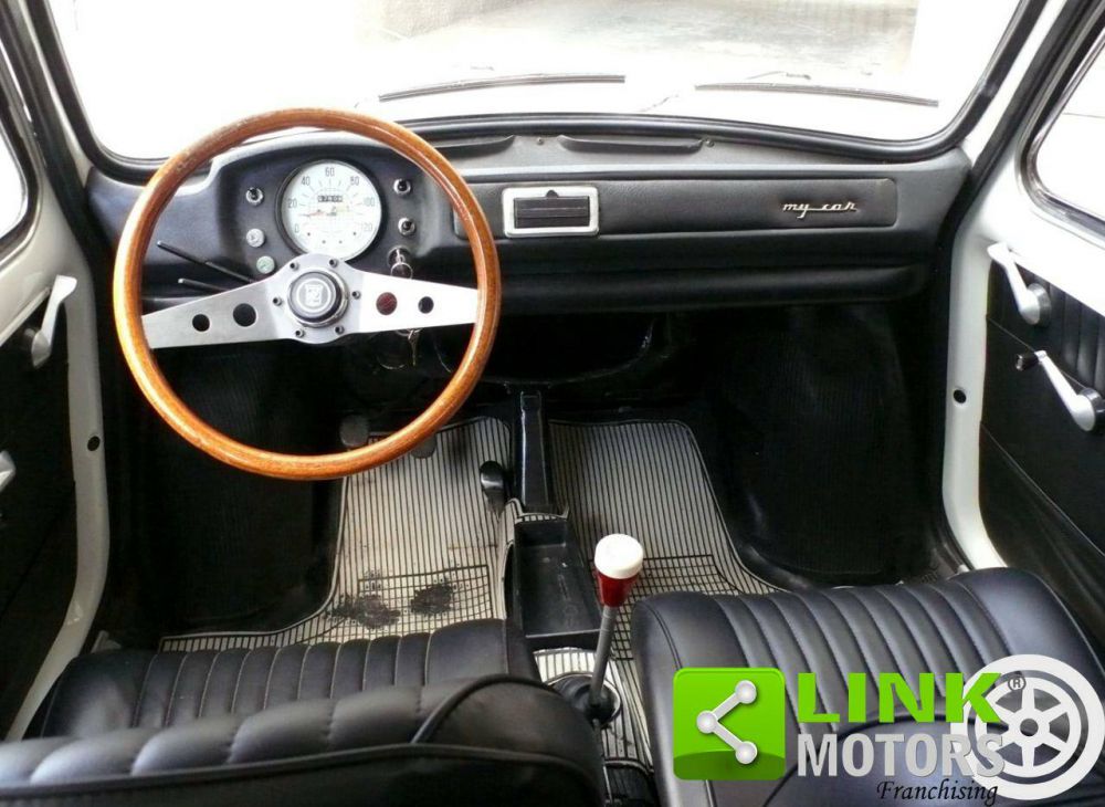 Interni originali e ben rifiniti con plancia fuori serie e strumentazione arricchita, volante Ferrero con corona in legno. Selleria e interno portiere in similpelle nera a costine, ottime condizioni.