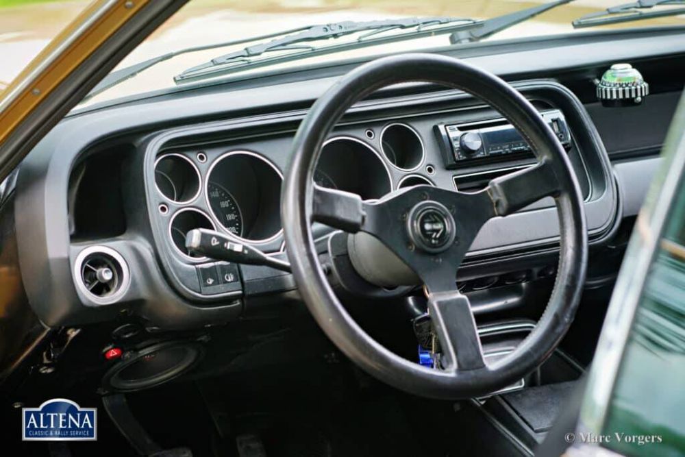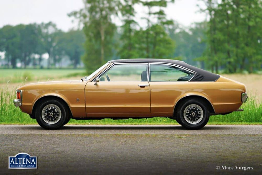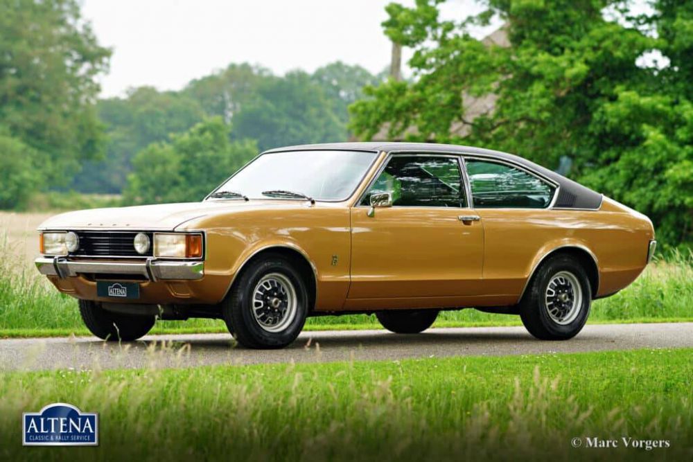 Ford Consul 2.3 GT Coupé, year 1974. Chassis (VIN) number GAGCPR67770, engine number 67770. Colour bronze/gold metallic with a black vinyl rooftop, combined with an anthracite/black cloth/leathercloth interior trimmed with black carpet and black headlining. This magnificent Ford Consul 2.3 GT was sold new in France and the car has driven only 57.000 kilometres from new! This fine Ford is in an excellent and wonderful original condition! The bodywork shows perfect paint, a perfect black vinyl roof, superb chrome brightwork and a pristine original interior! The exterior panels were perfectly repainted in the past, the paint inside the doors, bonnet, and tailgate openings are all original and the new paint matches perfectly! All the original factory decals are still present. This Ford Consul GT is a unique time capsule, it will be hard if impossible to find a second example in this never restored original condition! The ford Consul was available as a four-door saloon, estate car, and as 2-door fastback coupé which is the rarest model. The Ford Consul was also badged Ford “Granada” depending on the engine and sales market. After 1975 all these Ford models were named Granada. The Ford Consul 2.3 GT is powered by a 107 DIN bhp Ford “Cologne” 2.3 litre V6 engine, mated to a 4-speed manually operated gearbox which transmits the engine power to the rear wheels. The all-independent suspension offers excellent handling and a comfortable ride. The current owner has fitted a modern Momo sports steering wheel and a modern radio, the original steering wheel and a period radio are with the car. This Ford Consul is fitted with a period compass on the dashboard, and it comes with the original keyset. The full history is documented and is complete with the original booklets. The Ford has received a full service, and everything is up to date. Invoices of the most recent work are present. This Ford Consul 2.3 GT Coupé is a rare and fantastic find for the (Ford) classic car enthusiast!
