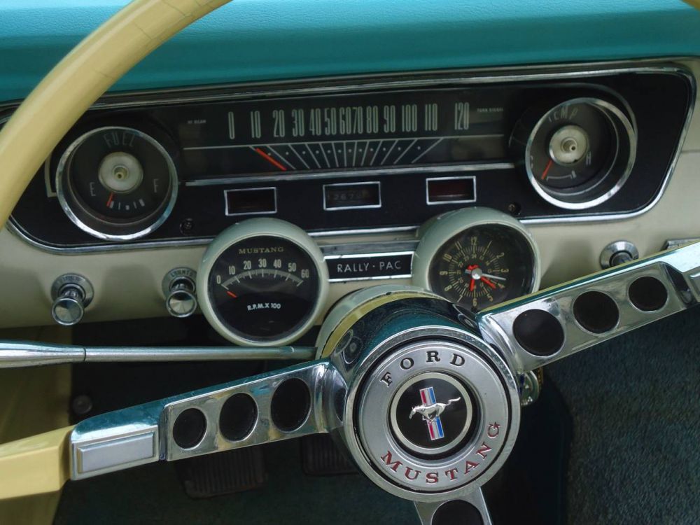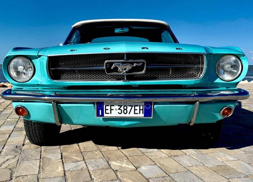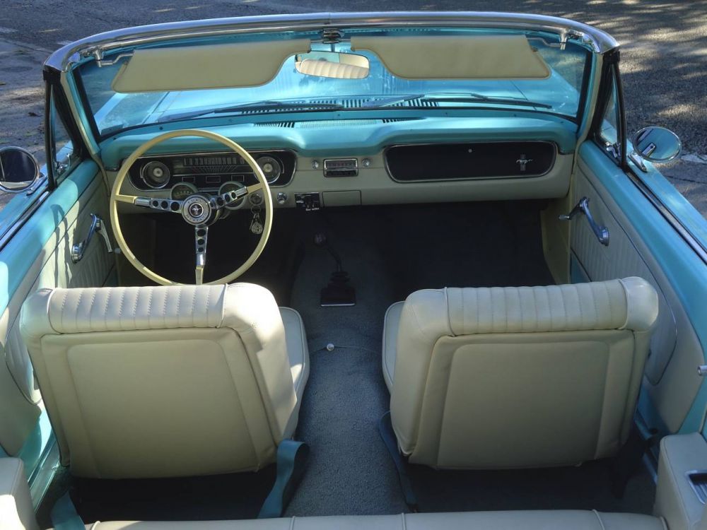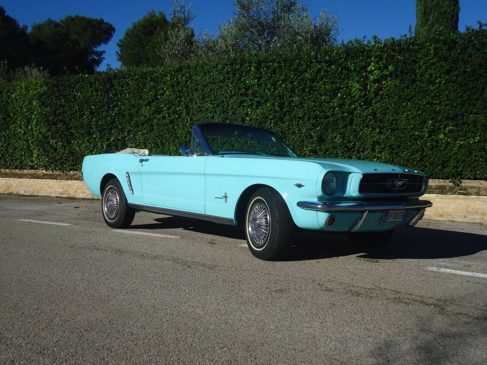 Ford Mustang 289 Convertibile prima serie Prima serie anno 1965 prodotto in Michigan motore V8 289 con 200 Cavalli colore Tropical Turquoise interni luxury con rally pack cambio manuale tre marce completamente matching numbers condizioni top.Vettura interamente conservata con la gran parte della carrozzeria prima vernice tutta la tappezzeria originale mai restaurata compreso cappotte e copri capottes e cinture di sicurezza e radio tutti gli stickers e targhette originali macchina intonsa.Mercato di destinazione Europeo fin dalla nascita Germania poi Italia. Condizioni da concorso.Un esemplare identico anche come combinazione colore appare nel film Agente 007 – Thunderball del 1965