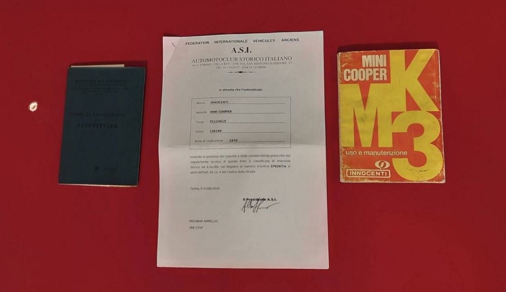 A metà anni '60 il boom automobilistico dell'Innocenti coincide proprio con la commercializzazione della Mini (Mini Minor). Fabbricata su licenza della British Motor Corporation, con scocche stampate in Italia e meccanica proveniente dall'Inghilterra, la Mini viene costantemente aggiornata e migliorata, anche rispetto alla versione originale inglese, per l'esigente pubblico italiano (finiture più lussuose), il che porta a farne una vettura trendy, di successo e dalle indiscusse velleità sportive nelle versioni Cooper. All'inizio del 1970 le Mini adottarono le modifiche delle contemporanee Mini inglesi contraddistinte dalle precedenti versioni dalla sigla MK3. Molte le modifiche: spariscono i vetri scorrevoli sostituiti dai vetri discendenti senza deflettori (solo 4586 esemplari), spariscono le cerniere delle portiere esterne, all'interno migliora l'aerazione dell'abitacolo. Acquistata da un trentaduenne ragioniere di Fiorenzuola (PC), questi la tenne per 4 anni, cedendola poi nel 1974 ad una giovane e dinamica trentunenne di Piacenza, che la tenne per tanti anni, conservando così le targhe ed i documenti originali. Sostituita in epoca recente, è stata sottoposta ad un restauro di ottima fattura che ha riguardato in particolare la carrozzeria che è stata risanata e riverniciata completamente.  Anche il cambio è stato rigenerato ed il motore rettificato nel 2019 e da allora ha percorso 12935 km. Completano la presentazione, gli interni originali, restaurati e sanificati e con i cristalli originali. Matching number e matching color, dotata di CRS, targhe originali, libretto originale ed uso e manutenzione, con il montaggio di un pratico stacca batteria, è sicuramente una vettura di interesse storico per il collezionista attento.