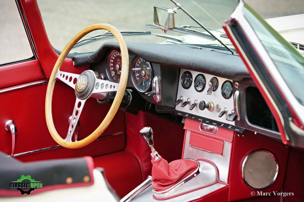 This rare early Jaguar E-type shows wonderful original details like the special bucket seats, the dashboard with aluminium finish and the 3.8 Litre cylinder head with pumpkin orange finish.