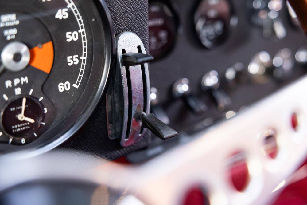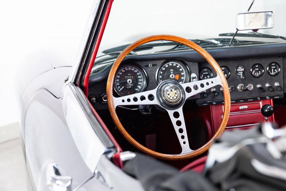 Unser E-Type? Dieser wurde von einem bekannten E-Type-Restaurator verwöhnt und in einen optimalen Zustand gebracht. Während ihrer Zeit auf dem Restaurationstisch hat sie einige moderne Upgrades erhalten, die sie jetzt sogar mehr als alltagstauglich machen. Es überrascht nicht, dass sich diese liebevolle Pflege auch in der dokumentierten Geschichte widerspiegelt. Jedes Detail wurde sorgfältig bedacht, von der elektronischen Zündung über die Stoßstangen aus Edelstahl bis hin zum Getrag-5-Gang-Getriebe.