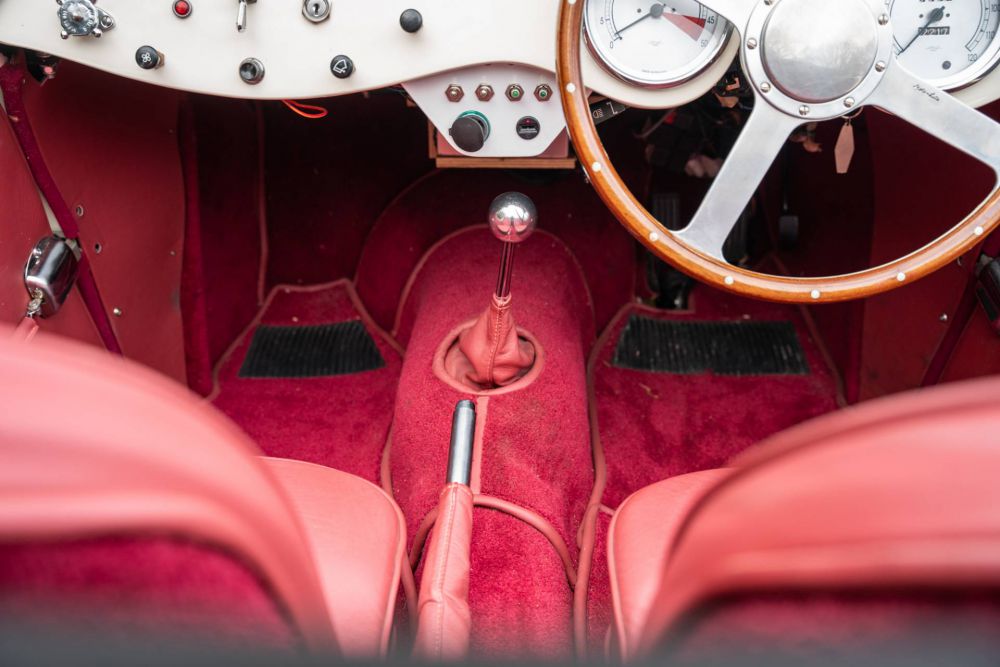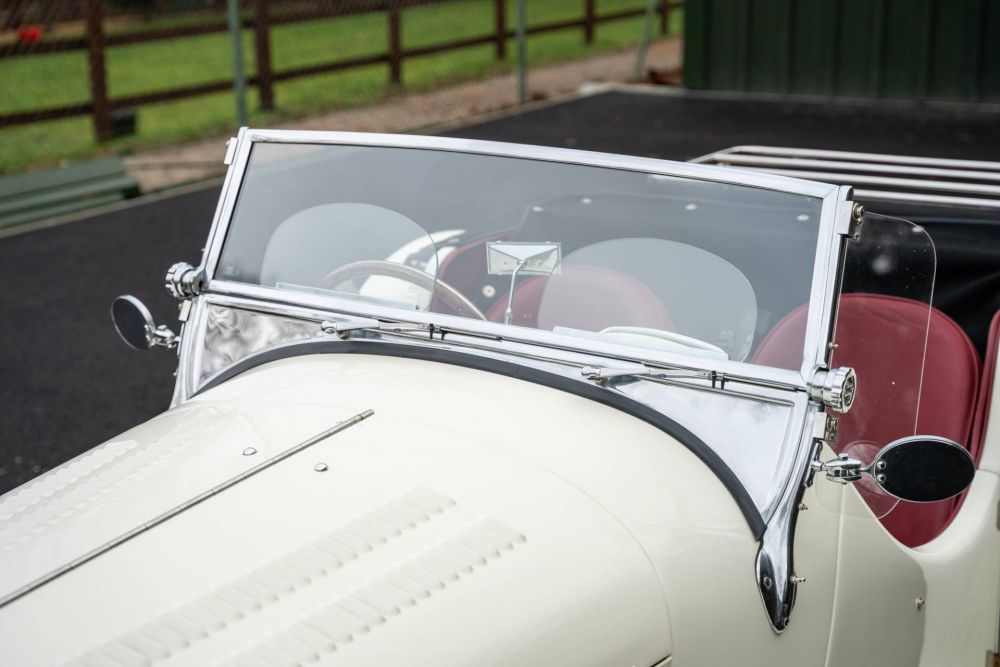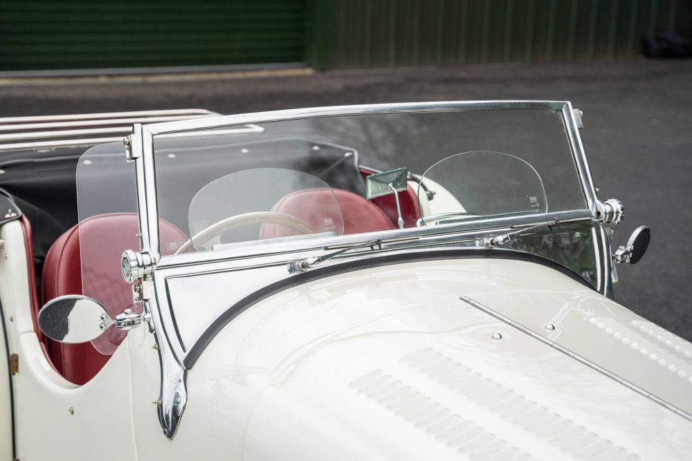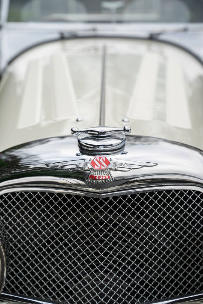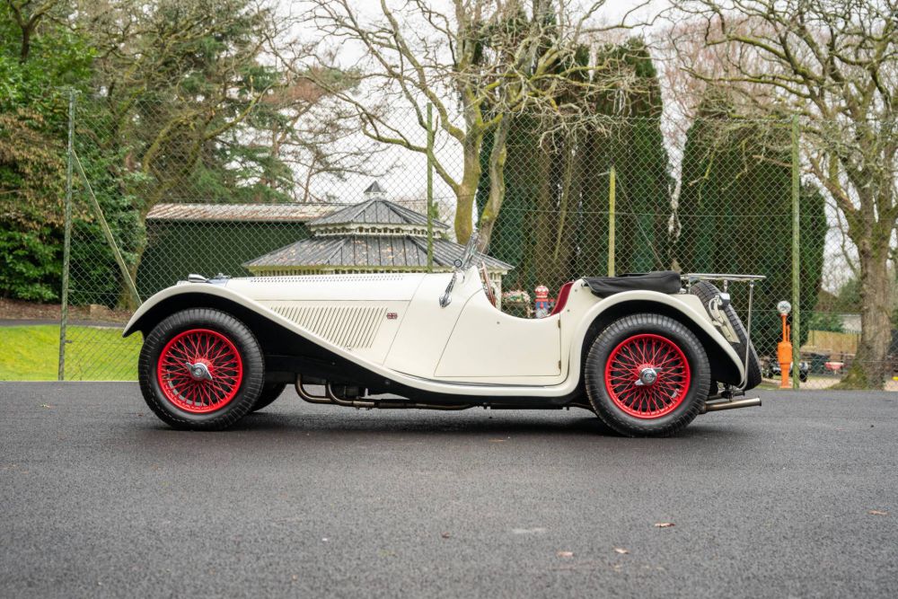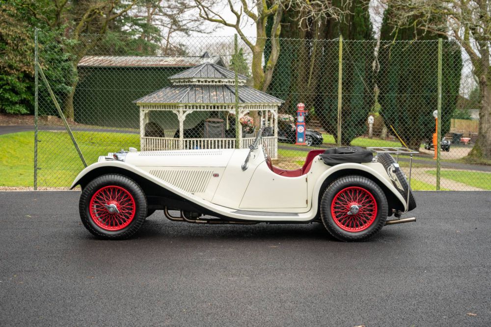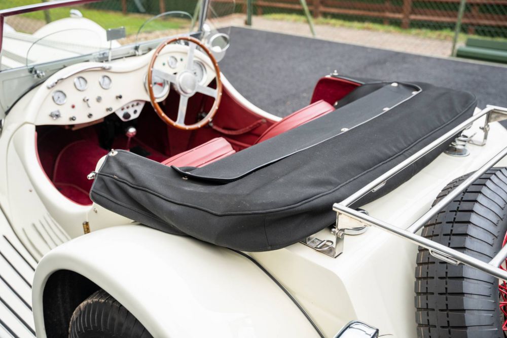 This is a stunning 1979 Jaguar SS100 replica by Suffolk Engineering of what is widely considered to be one of the most aesthetically pleasing Jaguar cars ever built. Finished in Old English White over a Claret dark red Connolly leather interior with red Wilton carpets, it sits proudly on wire wheels. The engine is a rebuilt Jaguar 4.2L unit and is mated to a four-speed manual gearbox with overdrive. Fitted with fuel injection, the SS100 runs very smoothly indeed. Furthermore, the paintwork and interior are very good. Likewise the engine bay which boasts smooth polished cam covers. It is offered with the side screens, tonneau cover, fitted hood and bag. The rebuilt engine ancillaries include starter motor, alternator, distributor, water pump and a twin pipe stainless steel exhaust system. Additionally, there are new disc brakes with adjustable shock absorbers on a six coil-spring suspension system, in addition to rack-and-pinion steering. This 1979 Jaguar SS100 Replica with a louvered alloy bonnet is a handsome addition to any collection.
