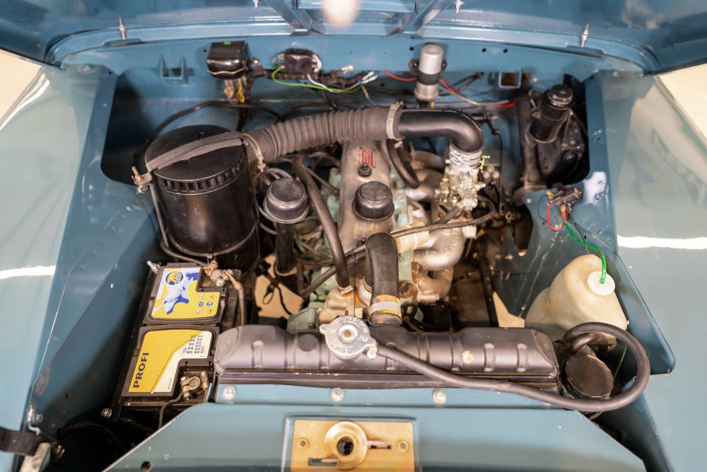 It was given a new fully galvanized frame, the body was repaired and repainted in Marine Blue.
