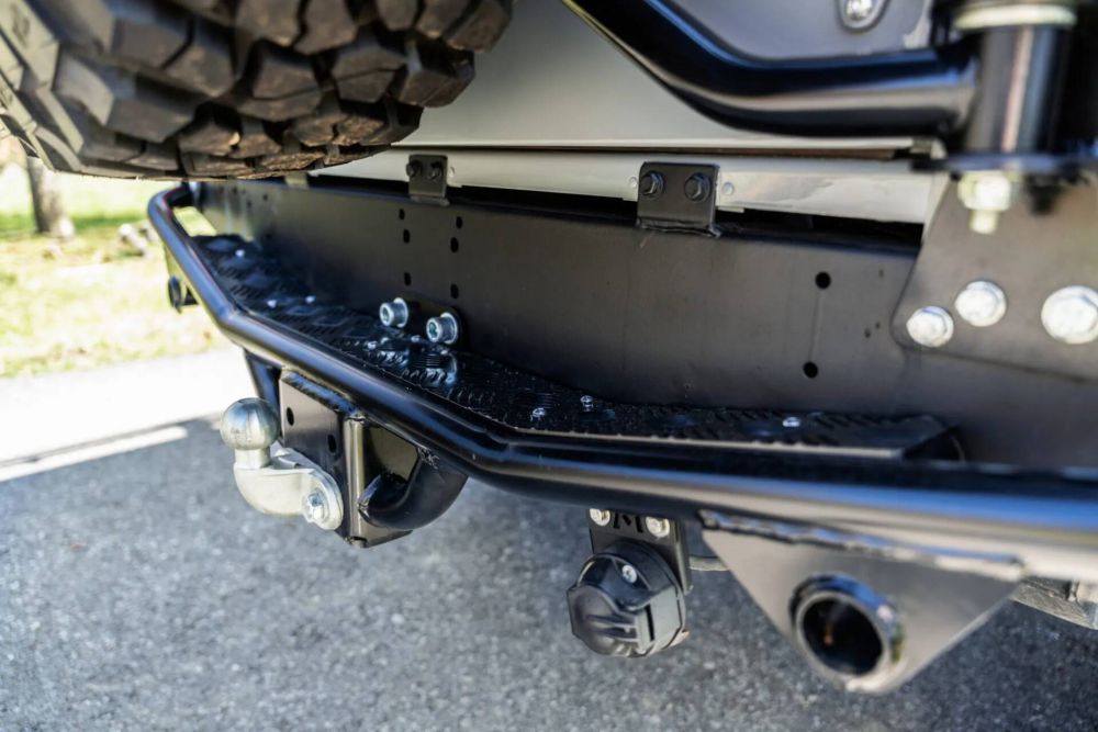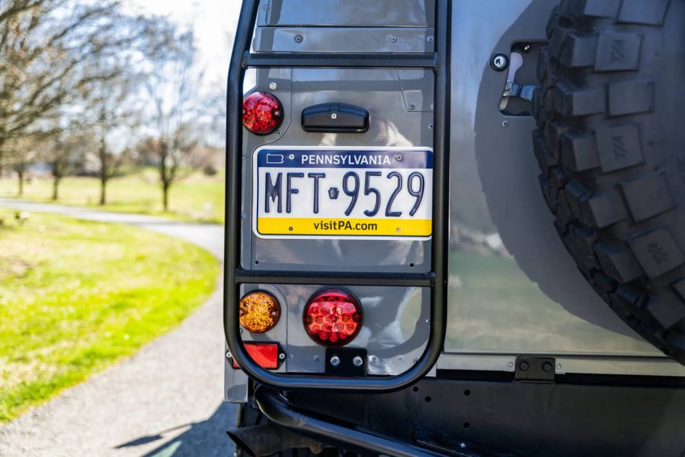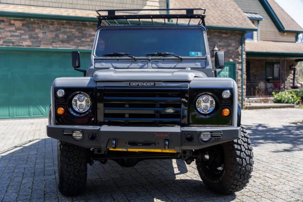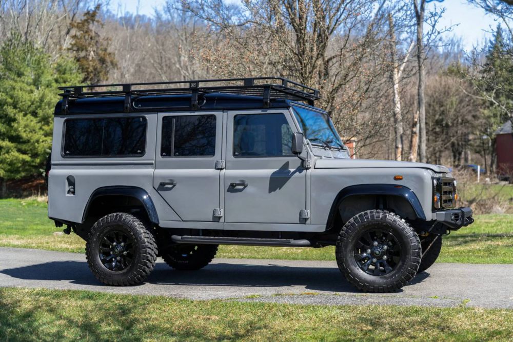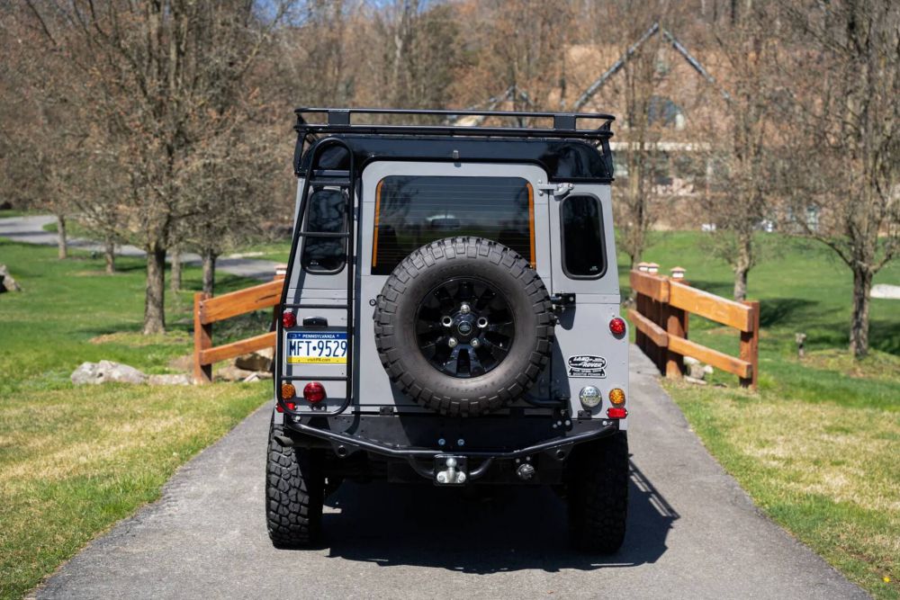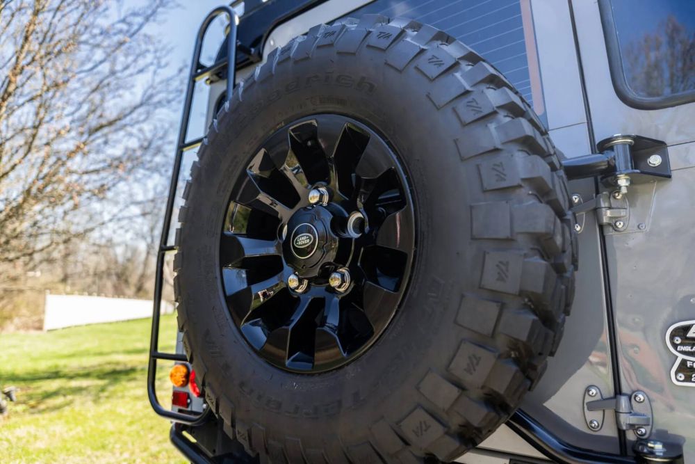 Prior to the vehicle’s export to the US, the Defender underwent a comprehensive body restoration and mechanical overhaul, as well as a fully reupholstered interior. The body restoration included new front wings, aluminum sills, reskinned doors to eliminate future galvanic corrosion, and a new rear door. The body was completely repainted in Audi’s Nardo Grey, a contemporary twist on Land Rover’s Welsh Grey. Upon reassembly, all fixings were replaced with stainless steel, and new gaskets, seals, and rubbers were fitted throughout. The vehicle presents in fabulous condition. Additionally, the vehicle is equipped with a selection of desirable accessories, including a KBX front grill and light surrounds, exterior LED lights and headlights, an uprated steering damper, a 2-inch lift kit, Sawtooth wheels fitted with 265/75 BFGoodrich Mud-Terrain T/A KM2 tires, a tubular roof rack and ladder, a NAS rear step, Fire and Ice-style side steps, and a custom-made front bumper with a concealed winch mount and LED running lights.