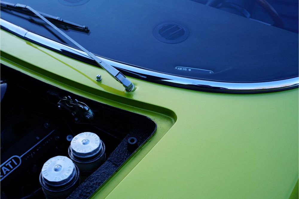 The car sits on beautiful Campagnolo wheels with good tires. The green paint is in very good condition, and the body is beautifully original with nice sheet metal and correct fittings. The chrome work is also in excellent original condition. The leather has developed a beautiful patina over the years, contributing to the original look of this Maserati Ghibli. The wooden steering wheel and original carpets are also in good condition.