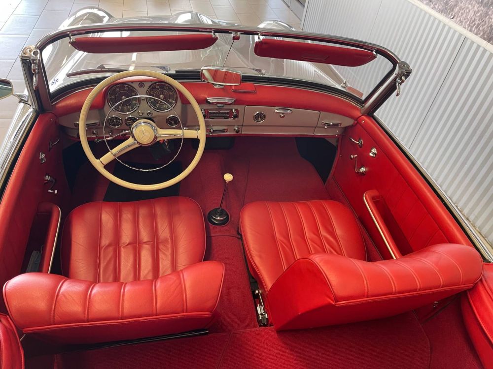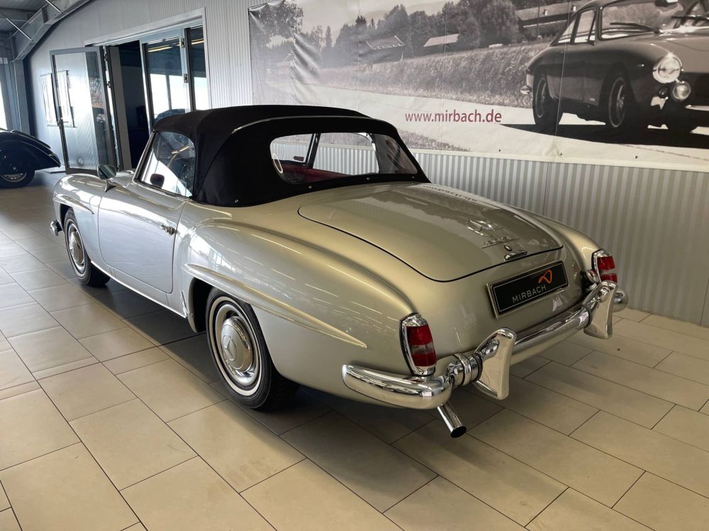 Die Erstauslieferung des Mercedes Benz 190 SL Roadster erfolgte 1959 in Augsburg. Ausgeliefert wurde der Wagen in Weißgrau (DB 158), Leder schwarz (953).