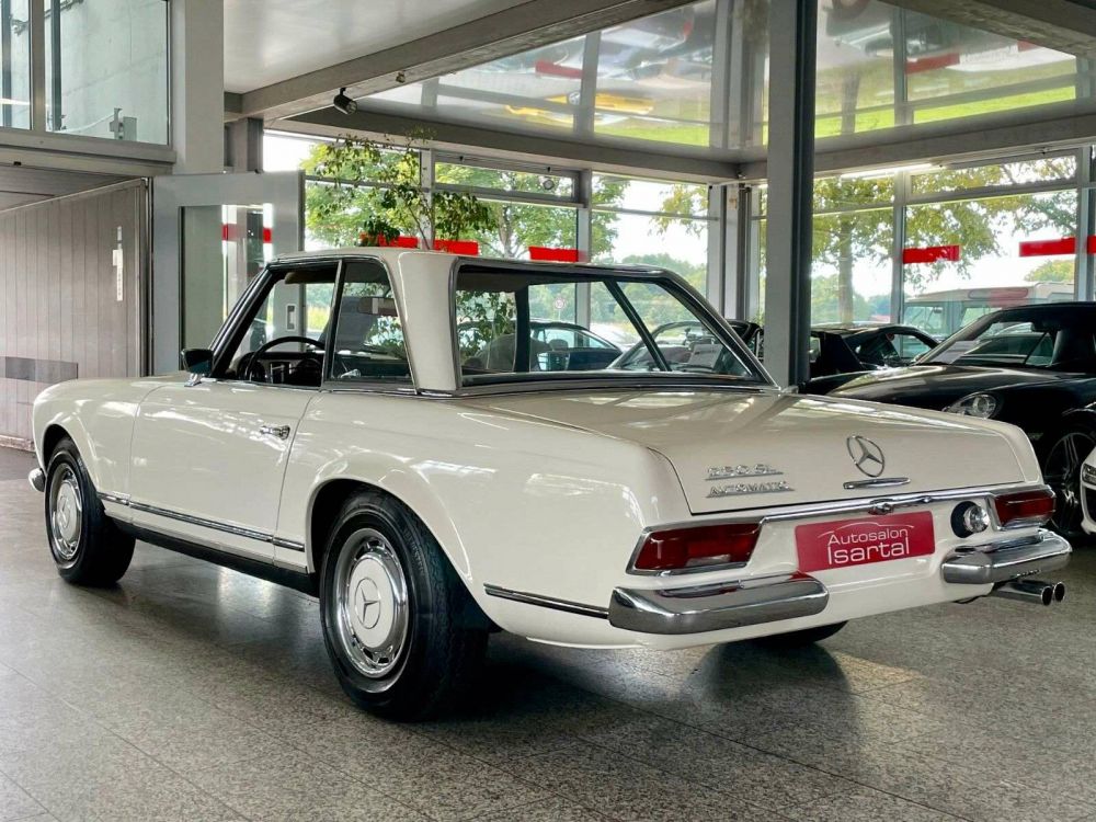 250 SL Pagode, VIN: 11304312003340, weiß (050), MB-Tex schwarz, Automaticgetriebe, Servolenkung, 3. Quersitz, Hardtop + Softtop, Radio Becker Europa, rechter Außenspiegel, EZ 17.08.1967, immer in Deutschland zugelassen, seit 1991 zwei Besitzer, wir haben dieses Fahrzeug bereits vor 22 Jahren an die jetzige Eigentümerin in München verkauft, Interieur original mit Patina, 1995 Karosserie + Lack restauriert, 1996 Technik + Motor überholt bei Pagoden-Center STICKEL (Rg. hierfür von ca. 45.000,--DM liegen vor, sowie umfangreicher Dokumentenordner mit Datenkarte) - seitdem ca. 40.000 km gefahren und immer bei Münchner MB-Spezialisten fachgerecht gewartet mit vielen verbauten Neuteilen, H-Kennzeichen, sehr gute Technik + Fahreigenschaften, Automatic schaltet ruckfrei !, lange Hinterachsübersetzung - daher Langstrecken- und Autobahntauglich,