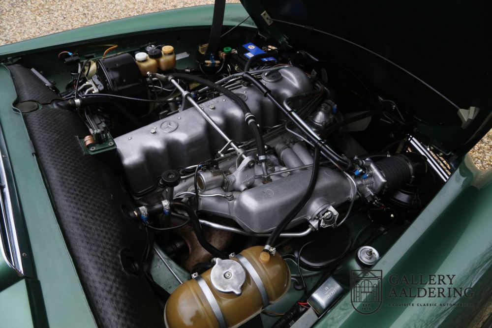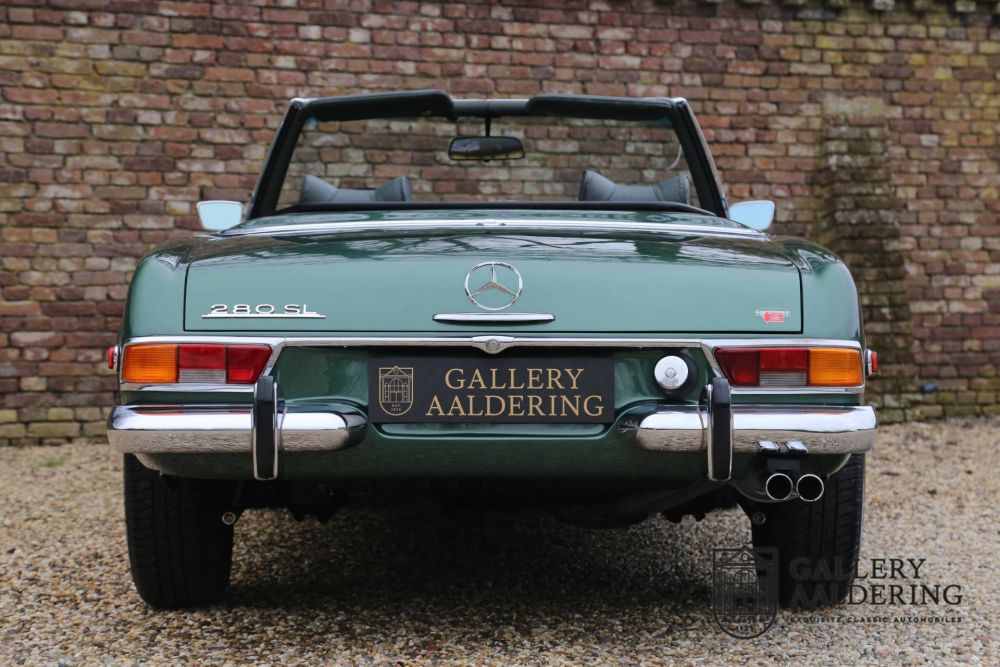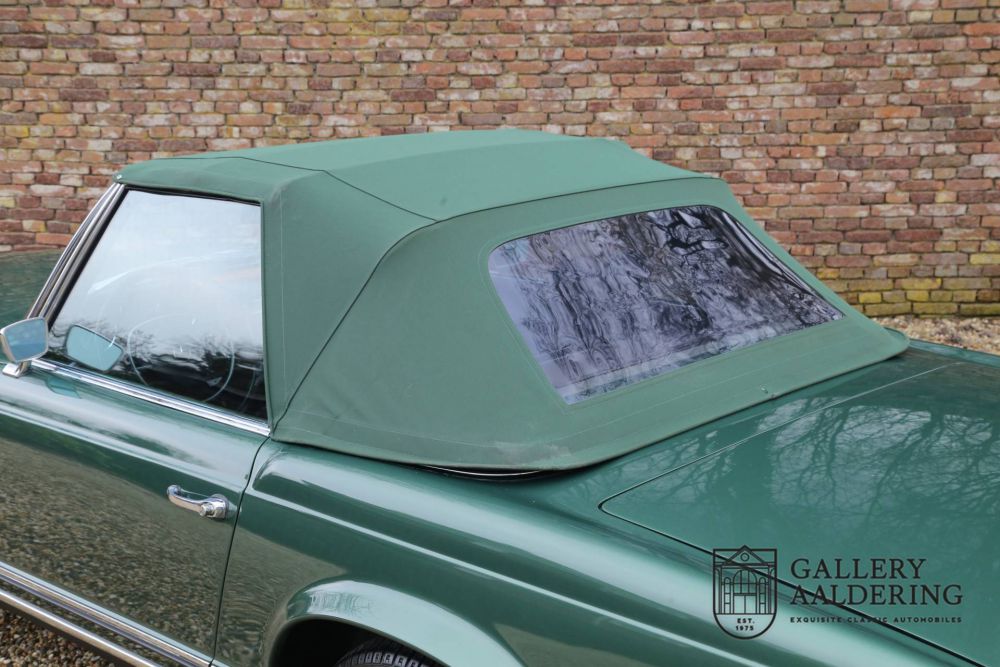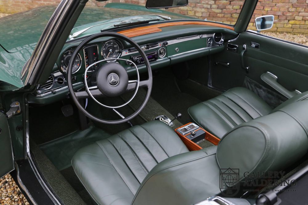 The 280 SL that we offer here is one in a fantastic and rare color scheme: green paint, a green interior and a green convertible top. We have not encountered the combination before and can only say that it makes for a beautiful whole.