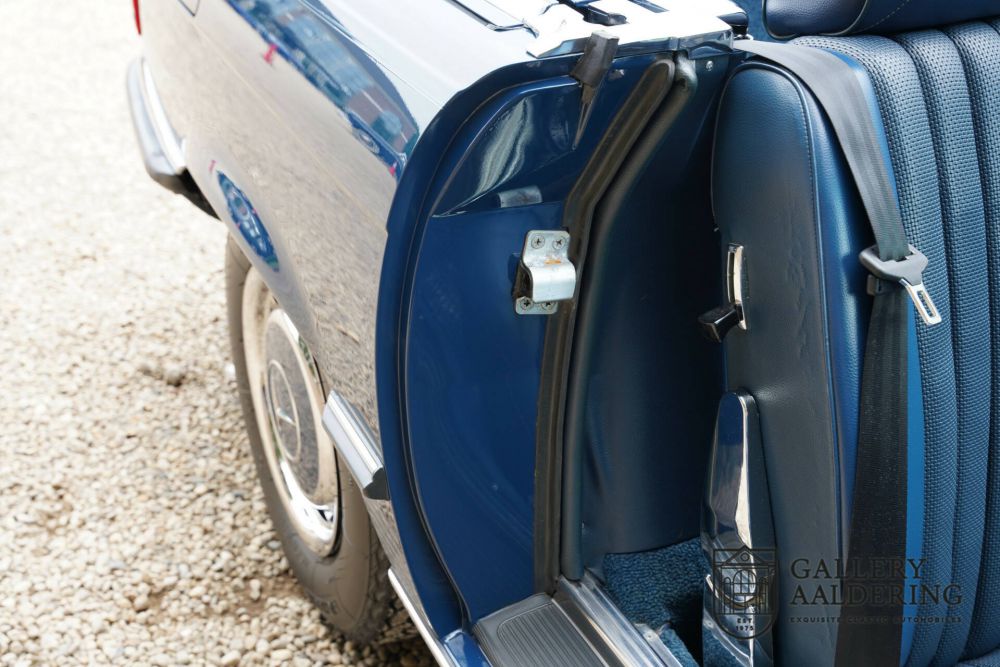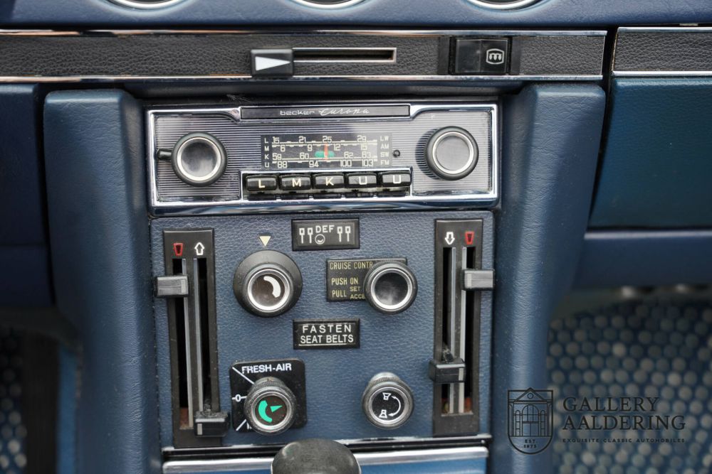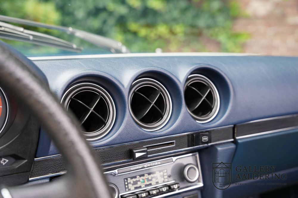 The first owner of this Mercedes-Benz 450 SL ordered their car in dark blue with dark blue leather upholstery and a dark blue convertible top – a 'triple blue' setup. A stunning combination that exudes style and adds extra flair to the car. The fact that the buyer also opted for the smooth V8 engine speaks volumes about their taste. With 225 horsepower, the 450 is the second most powerful version after the 500 (and the American 560). With its beautifully arranged V8 engine producing a delightful sound, there's ample torque and power over the whole range. Smooth, strong, and elegantly spirited. In short: a versatile performer.