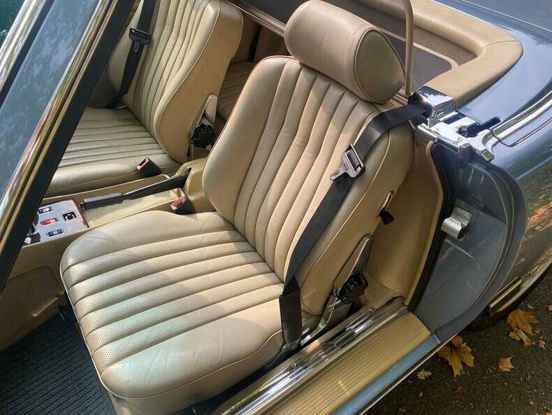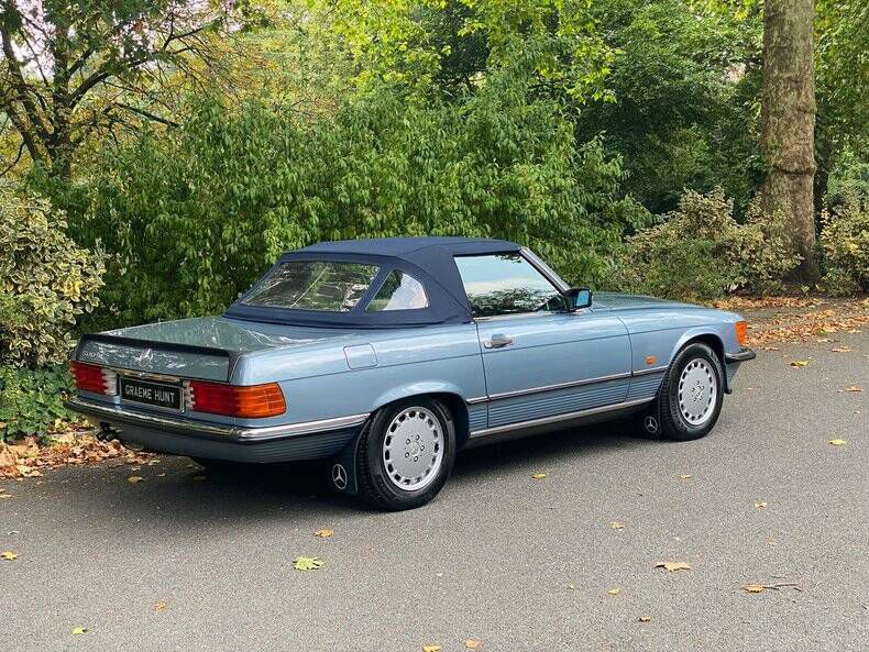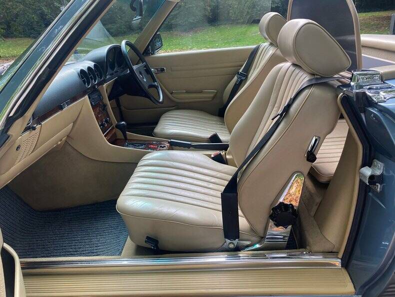 The 500SL comes with a fresh set of Michelin tyres (including a brand new spare tyre), modern Blaupunkt Bremen SQR radio / media player, although it looks as though it's from 1989, beige leather effect wind deflector, electric aerial, MB mud flaps, stainless steel exhaust, head lamp wash/wipe, cruise control (std on 500SL), MB overmats, rear seat base with seat belts, original Medical box still in the boot, wood veneers are unmarked too and the underside is in as immaculate condition as is the rest of the motorcar