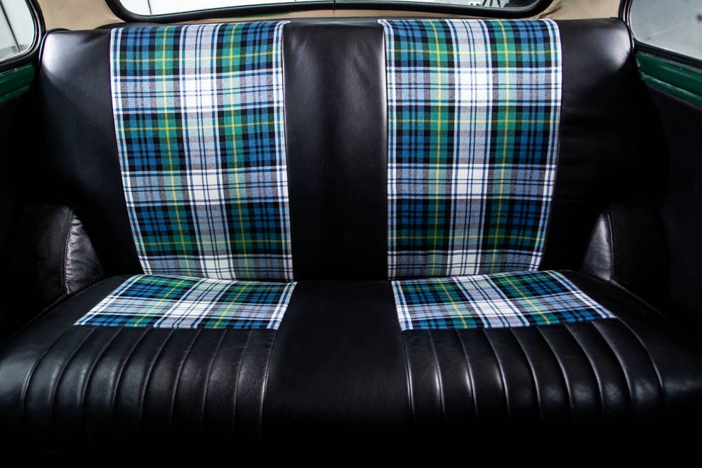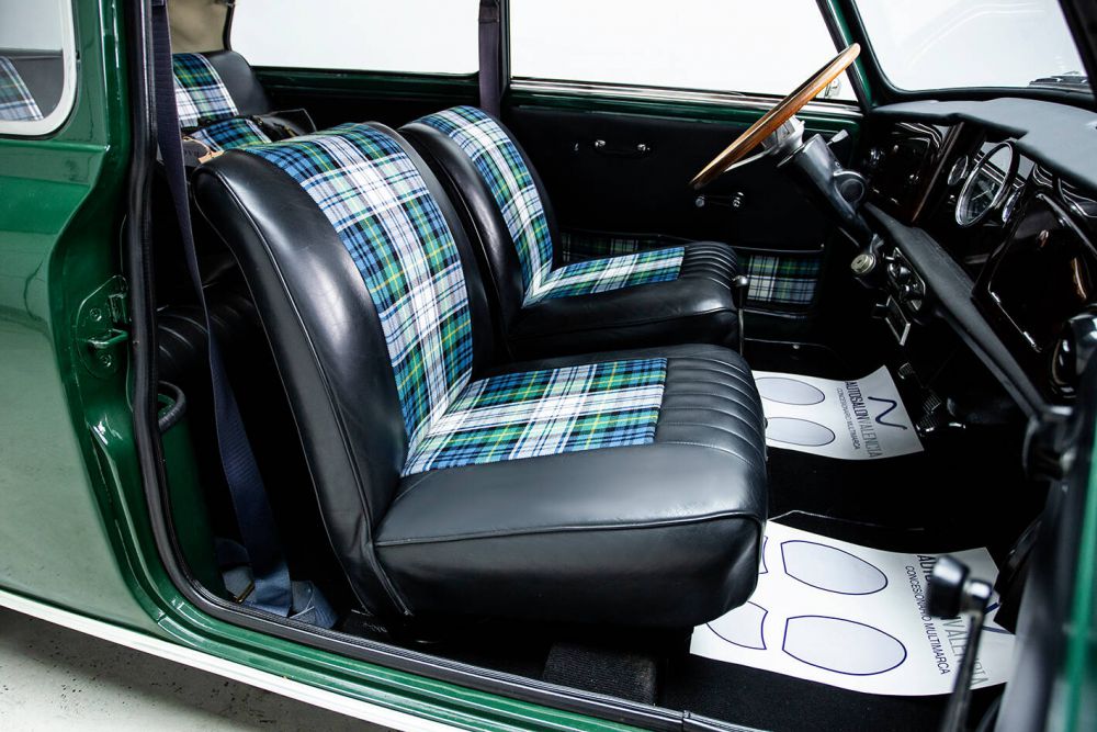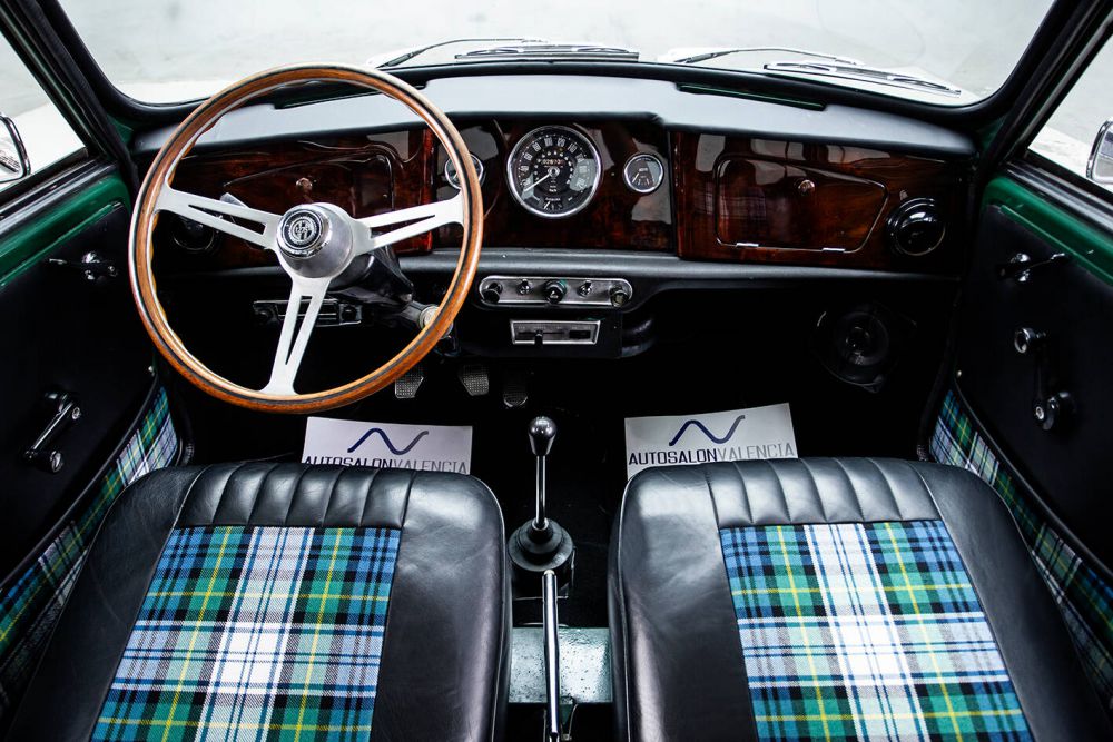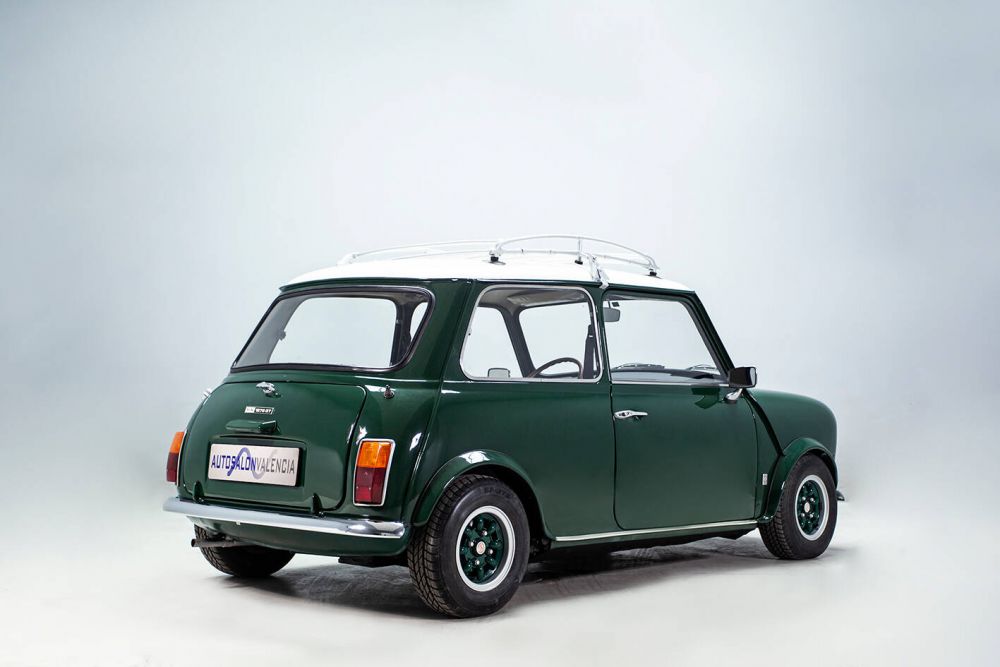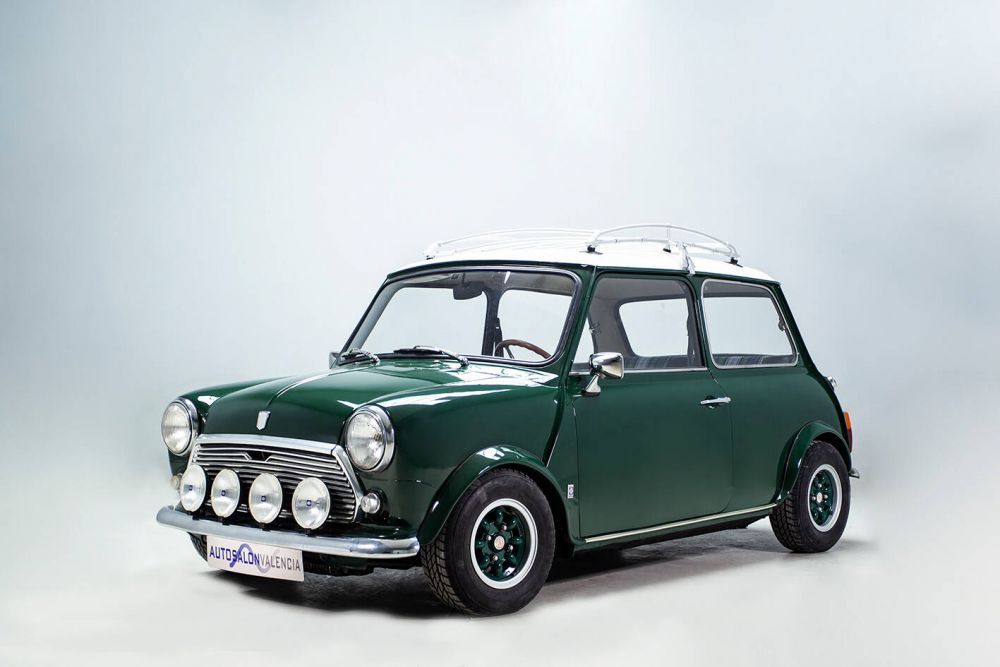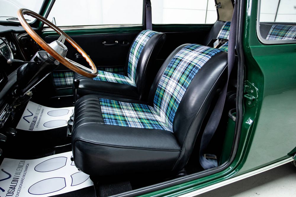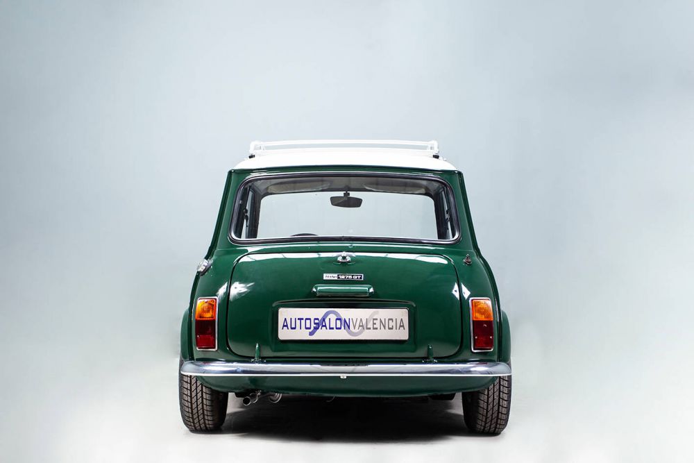 BRITISH RACING GREEN WITH OLDWHITE ROOF AND INTERIOR BLACK LEATHER AND TARTAN GREEN. MAPLE WOOD DASHBOARD WITH CENTRAL CLOCK. MINILITE WHEELS. LONG RANGE HEADLIGHTS. PERIOD ROOF RACK AND MATCHING LUGGAGE. THE VEHICLE HAS BEEN FRESHLY PAINTED AND ALL ITS MECHANICS, ENGINE, BRAKES, GEARBOX, ETC. A PERFECT CLASSIC MINI FOR ANY EVENT, WHICH HAS KEPT ITS CLASSIC AESTHETICS, PRESERVING ITS CHARM AND FUN AT THE WHEEL. THE MOST POWERFUL MINI OF ITS TIME IN SPAIN, A REAL SPORTS CAR IN A REDUCED SIZE, A DELIGHT ON MOUNTAIN ROADS. PERFORMANCE AND CONSUMPTION The car with a weight of 640 kgs. and 63 hp. has a weight/power ratio of 10.1 kg / hp. The 400 m. start from standstill: 19‘8/10, 1.000 m. s. p.: 37’8/10: 400 m. starting at 40 km/h.: 20‘2/10, 1.000 m. starting at 40 km/h.: 40’7/10, 1.000 m. with a 1 km. launch: 27’ (133,3 km/h.). Top speed: 140.3 km/h. Acceleration: 0-100 km/h. 15’. On a mixed road route (stretches of motorway, country roads, mountain passes) and with practically no traffic due to the time of day chosen, the average speed was 110 km/h., with a remarkable ease in keeping it high in bends. Consumption was 9.8 litres per 100 km. At a maximum speed of 4,000 r.p.m. consumption dropped to 7.5 litres per 100 km/h., and the average obtained was 80.7 km/h. City driving consumption is between 9.3 and 10.5 litres per 100 kilometres. The revs obtained in 1st and 2nd gears were 7,000 rpm and 6,800 in 3rd gear, reaching 5,250 rpm with relative ease in 4th gear.