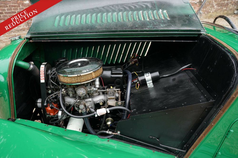 The paint is neatly cared for and looks nice. Is there actually a better color for a Morgan? The car stands on the beautiful original steel wheels with the original hubcaps and tires in the correct sizes. The underside of the car is also neatly cared for. The chrome is neatly cared for as well as the lighting. The bumpers fit neatly and the hood also has a good fit.