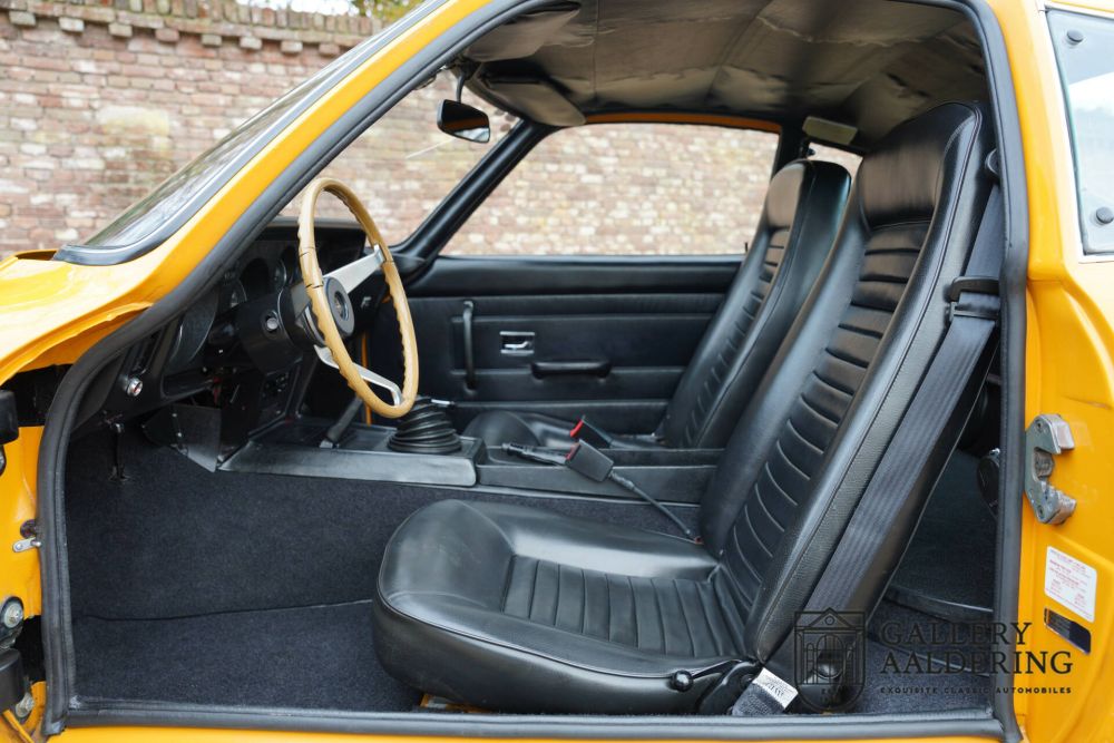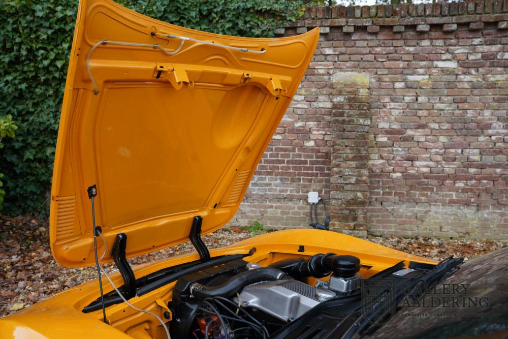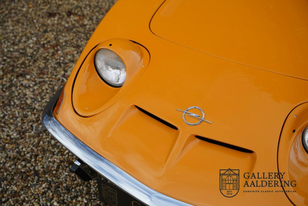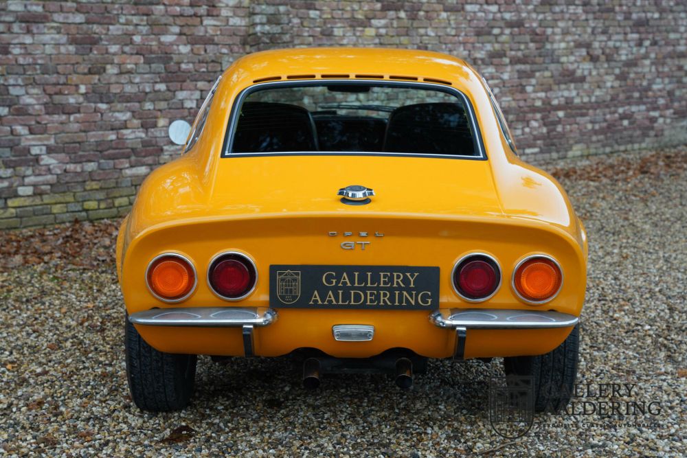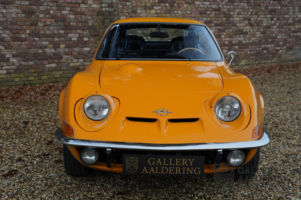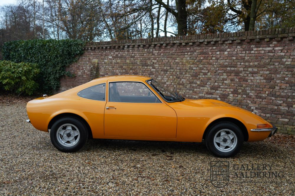 This 1972 ocre yellow GT has been fully restored. Photographs of the restoration confirm the “bare-bones” approach taken in order to perfectly rebuild this GT to the state you see before you. The condition of the steel bodywork and paintwork are therefore excellent, with beautifully aligned panelwork. The seams of the boot lid are even totally absent, Opel decided you would not need easy access to the boot space. Any luggage or baggage would have to go through the normal doors. Once inside you realise how neat everything is. Neat seats, pristine carpets and a very tidy dashboard. The original steering wheel does show some signs of wear. The are no major deficits or damage to be found, the compact and bijou interior is quite inviting.