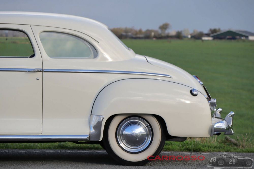 This stunning 1948 Plymouth P15 Special DeLuxe Club Coupé is true vintage class. With its creamy white colour and blue leather upholstery, this car is a sight to behold. The Club Coupé design not only offers a coupé experience, but also guarantees space and comfort for passengers in the rear. The original Plymouth factory radio adds an authentic touch to the interior.